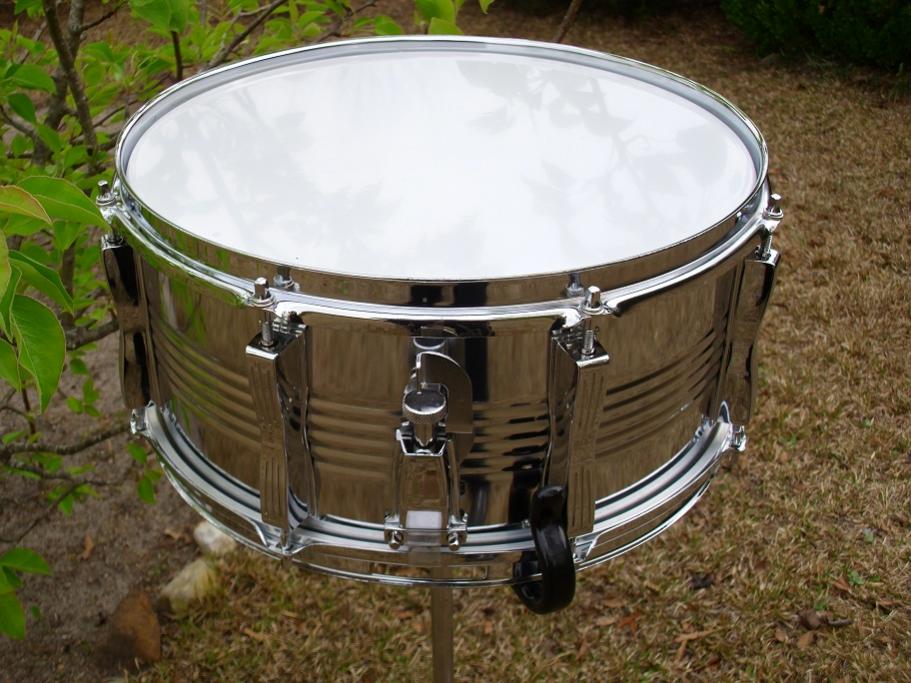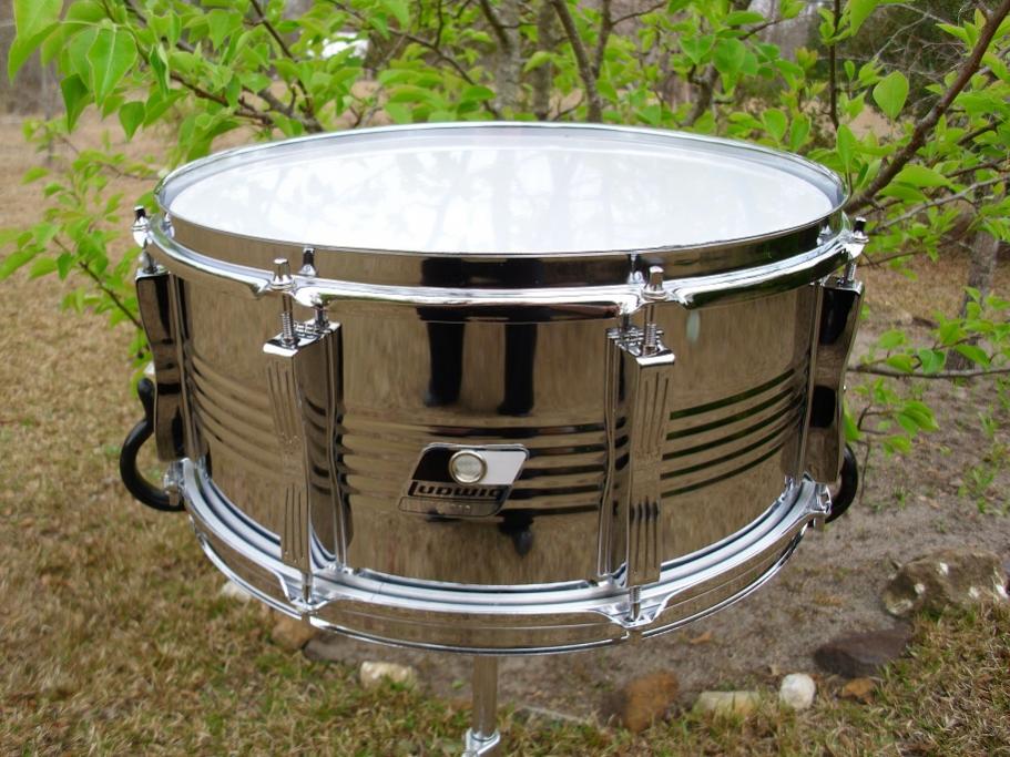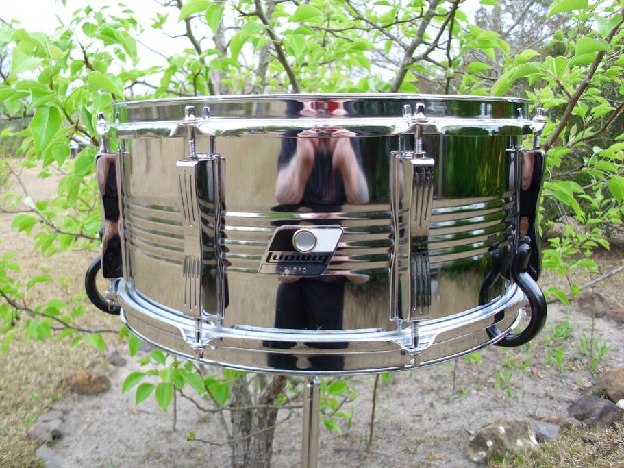 This is a Ludwig 6.5x14 8 lug Black/White badge Steel snare drum. Features 8 large bowtie lugs. Not exactly sure when this model was made. It looks like new though! Chrome shell and all hardware look fantastic. Serial number is hard to read but looks like 904380. This is a welded seam shell and I would imagine an import shell. No date inside. The 8 lug shell sounds full and yet has a good snappy crack to it. Everything works well. No tone controls on these models. Snares are 20 strand steel. If you've been looking to add a steel shell model to your arsenal, this beauty may be the one for you. Heads look great. Has been completely detailed,tuned and ready to ship to you.