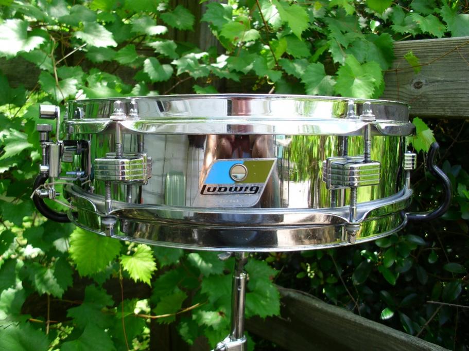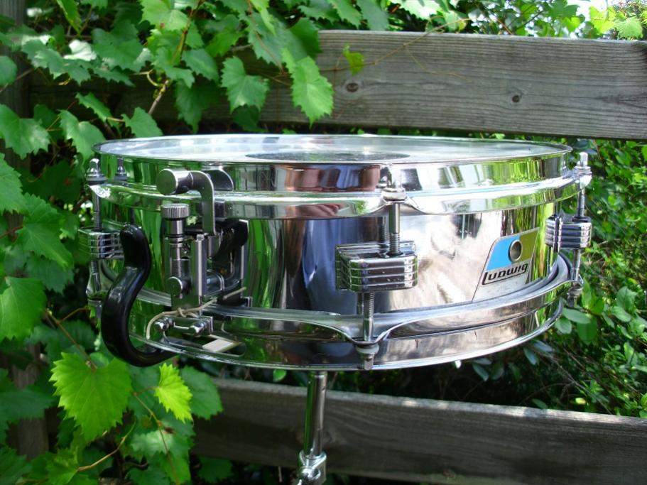 These model 405 3x13 metal Piccolo snares are first shown in the '71 Ludwig catalog. These are not super rare but are much more uncommon than your average Ludwig snare. These shells are ludalloy (mostly aluminum) just like the Supras and the Acros. Shell has the Anti Galvanic ink stamp inside but no date stamp. Blue Olive pointy badge serial number is 804943. This drum has side by side double drilled holes for the strainer. I have seen two or three others with the same. Appears to be a factory oops with the location. This drum came to me without the original strainer. I just recently purchased a new Ludwig replacement strainer that fits the existing hole pattern. Works great! With the new strainer installed, you cannot see the side by side duplication.