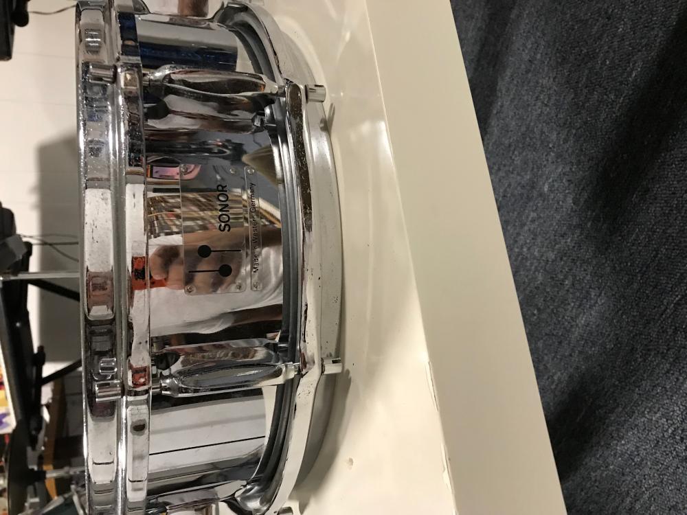 Somewhat of a rarity, this D-424 model is the metal snare that pre-dated the D-444, which came with Teardrop kits in the 60s. Ferro-manganese shell, all original parts in working order, tone control in perfect shape, strainer is missing the cap (just about all 60s Sonor snares are). Top washer on butt end also missing but doesn't affect anything. Have pure sound equalizer wires on it now, but also still have the original Sonor wires that came with the drum. Chrome is clean with a few small rust spots on hoops.