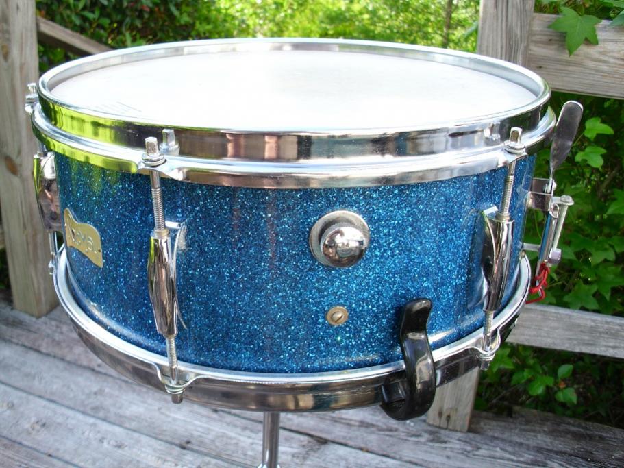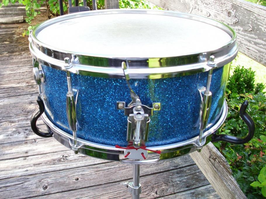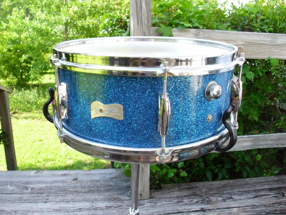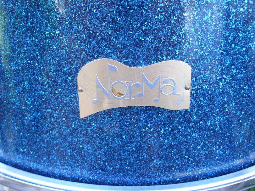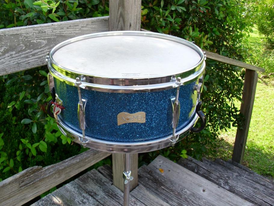 I bought this some time ago from the original owner...actually his sister. Drum had been tucked away for decades. In really nice original condition. This is a 60's Norma snare in Blue Sparkle. Has stick saver style hoops, 12 strand snare wires, 6 lug model. Has a neat older Remo Sound Master batter head and and a Remo Ambassadore (yes with the E) snare side head. Strainer has a bit of play in the lever when snares are applied. Only in the lever itself,strainer works fine. Round knob tone control works fine. Forgot to measure but it may be a 5.5" deep model. Has a great vintage sound! Super nice drum to add to your MIJ collection or to start one now.