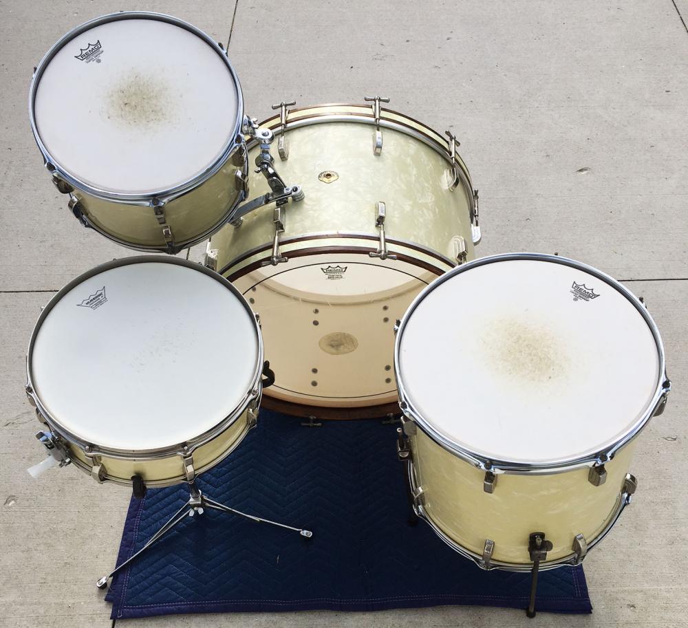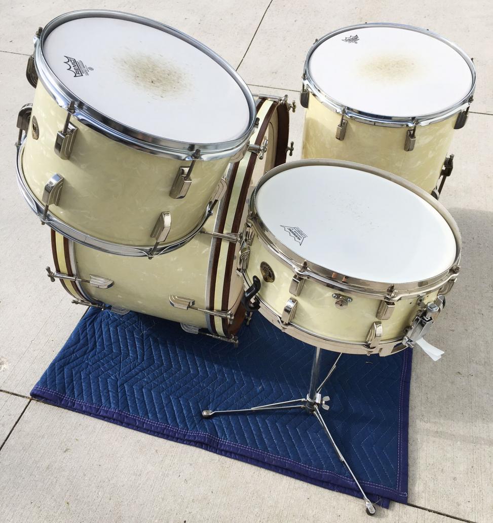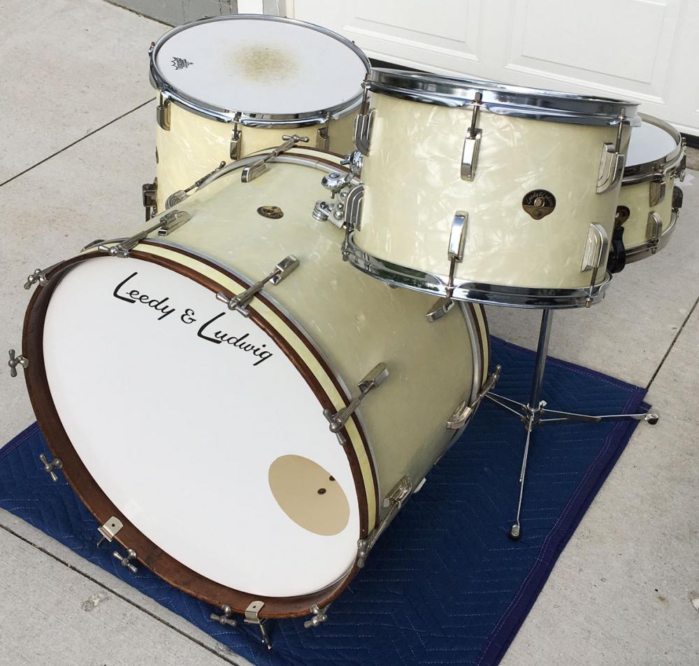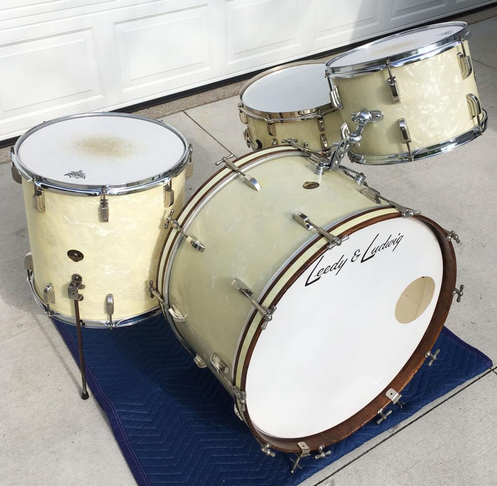 For sale is a beautifully restored Vintage Early 1950s Leedy & Ludwig 13/16/24 with 14 Snare in White Marine Pearl in great players condition. This kit was destined for the land fill but they were rescued and are now back from the dead and sound spectacular! Three ply shells in great condition and all in-round. The 13/16/24 shells have had a lot of work done including all extra/incorrect holes plugged and patched, interiors repainted and all new bearing edges. The WMP wrap is original and tight and was wet sanded a bit to bring it back to life on the 13/16/24 pieces. Matching inlays added to the bass drum hoops which are in good working order but worn. Hoops on the 13 and 16 not original. Hardware is a bit pitted and worn overall. The 14 snare is in great shape and all original besides the non-original strainer and butt which resulted in a couple extra holes that I have left for future conversion back to original if someone so desires. Overall just a beautiful kit that has a new lease on life and is ready to get back to work! Snare stand shown not included.