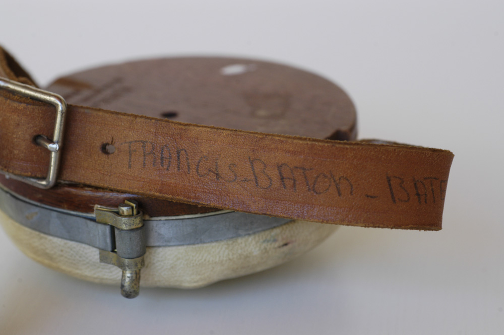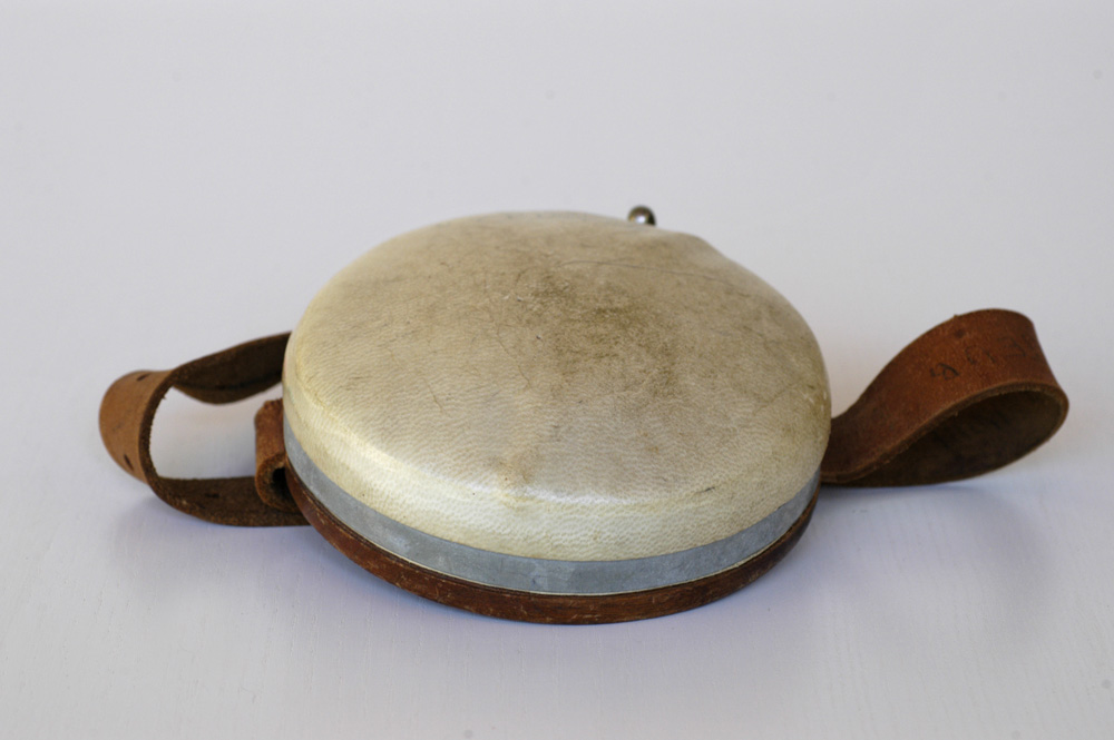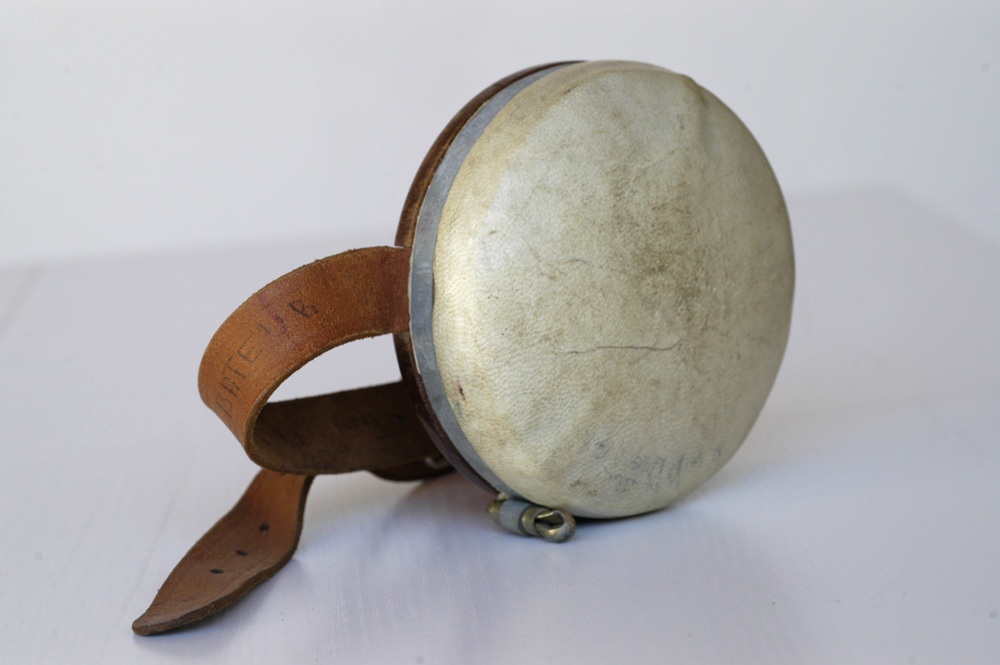 It's approx. 12cm in diameter and consists of three layers - a leather(?) cover, a metal ring middle layer and a wooden base - there is also a leather strap and buckle - the strap has the name Francis Baton Batteur written on it...any ideas or advice gratefully received!