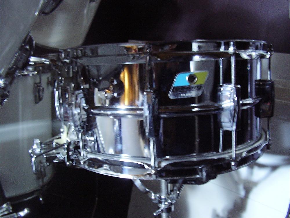This is a nice solid drum. It does have some pitting and flaking. The worst of it can be seen in a horizontal line close to the bottom in this picture, but it is in over all good shape. It has a perfect "LudaLoy" sticker inside.