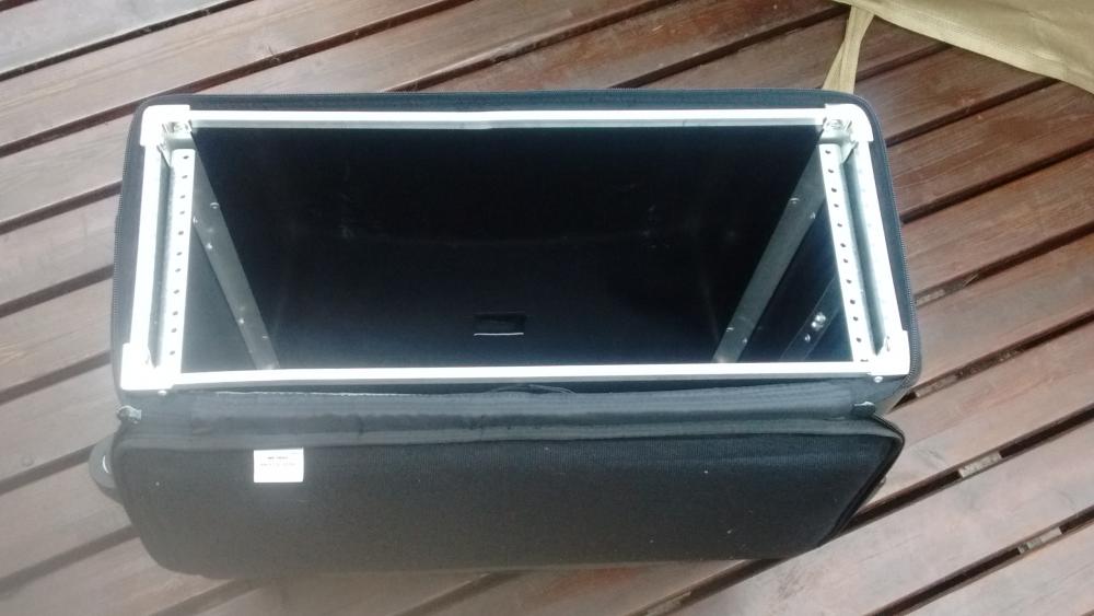 The exterior is covered with water-resistant luggage-grade nylon. Rigid flaps open in front and back, and the front flap has an additional 20mm foam padding to protect knobs and front panels. The rack rails are recessed to allow additional room between the front flap and your equipment. Comfortable bolted-in soft rubber handle on the top or using the extendible handle offer multiple transport options.