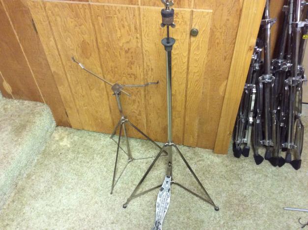 Some more photos....should have had my glasses on, as they are not attached by rivets, but screws. At any rate, very nice pieces. The person who played this kit, was not a weekend warrior back in the day, and played it quite a bit, as you can see by the wear on the pedal plate. They also knew what they were doing, as the foot plate on the hi hat stand is near mint, as the black you see is some form of rough tape residue..so the foot wouldn't slide during play. Also there is a few sticks as shown. One pair is Ludwig and Ludwig, one Leedy pair and a Slingerland. Had never in my lifetime seen a floor tom, spur foot taped to the end of a stick and can understand why..brilliant idea as to never have it slip out of your hand. Also not shown is a Duplex hoop mounted cymbal stand that was included.