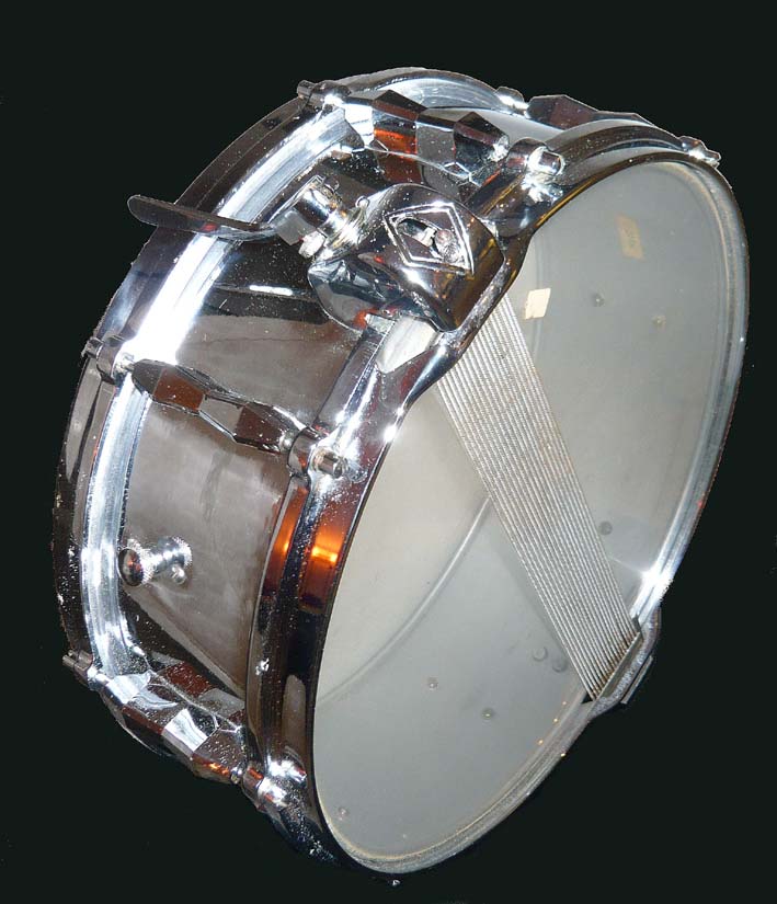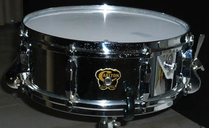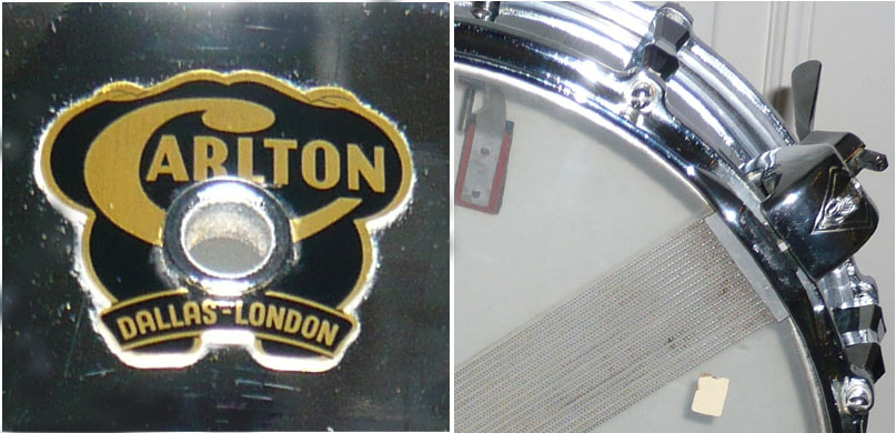 A Carlton (Dallas-London) metal 5"x14" with die-cast hoops and a beautiful throw of snares mechanism. It sounds great but it must have been aged maybe over 35 years.