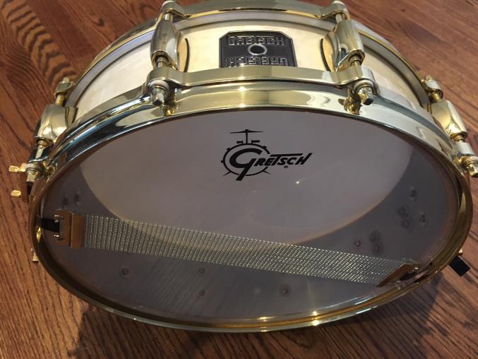 5 1/2 x 14 with gold hardware, die cast hoops, white marine pearl finish and has a gold snare as well. I have never seen one like it online.