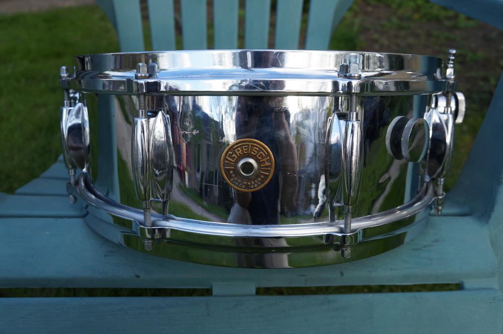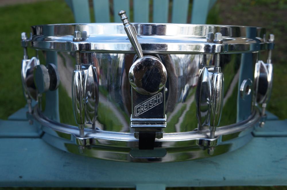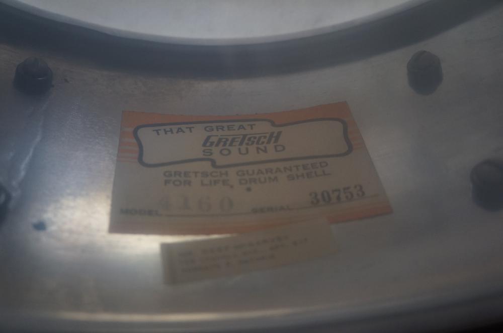 Quite clean and complete COB 4160 (pre-knurled version). I'm not a Gretsch expert, but I believe the baseball throw and butt are original - both solid and work well - has muffler - chrome very good with a few scratches here and there and two small dints about 3/8" across each - quite minor - low serial number - batter head is quite warn. No key and generic snare wires.