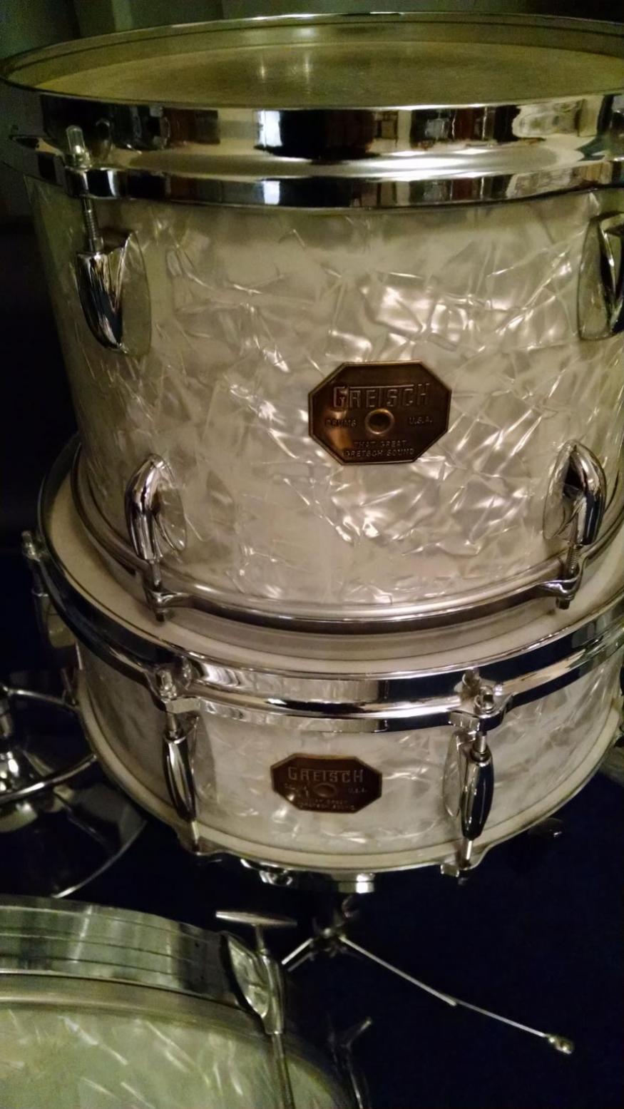 While hunting for SSB drums and parts for my walnut finish Salvation Army SSB kit, I found a Gretsch WMP 13" rack tom and 16"x16" floor tom from the very early 70's for sale together locally on Craigslist. My original intention was to use these drums as donors for the lugs, hoops, and other hardware to enhance the walnut kit. When I got the drums home I realized pretty quickly that I couldn't do it. They were just too nice to part out. So, I decided to do the same thing I was doing with the walnut kit. I searched out matching drums and hardware and put this kit back together. I got very lucky and found some great drums and parts for this. I went on an adventure to Santa Barbara to get the nearly perfect 22" Bass drum, the snare was a lightly used cadet snare, still in its original case with a flat base stand. A great find. The last and hardest drum to find was the 12" rack tom. All the drums are in great shape with no cracking or fading on the original wrap. The double tom mount and all the other hardware pieces I found were shiny and clean. The kit looks great and sounds amazing. This was a fun and challenging project. Special thanks to Starship Krupa for meticulous final assembly and tuning, as well as a wealth of great advice and encouragement throughout the project. This kit can be seen at the newly opened 3 Tracks Music in Portland, Oregon.