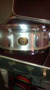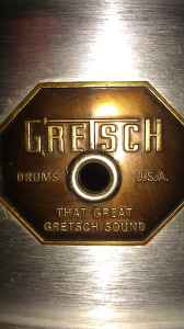 I picked this up today in a local pawn shop. I know very little about the drum other than what I read a few minutes ago on the Gretsch website (Badge Timeline). It's a 70's Stopsign Badge - first stopsign design....and from the Baldwin Era. Aluminum with a not-so-functional Renown Strainer. It's in good shape. The "button feet" snare stand came with the drum. It also had the barrel-shaped drum key hanging off the stand in a zip-loc bag. The store owner didn't know the hole in the drum is a key holder and was surprised when I clipped it into the drum....saying "that's pretty cool!" But he didn't raise the price after that.