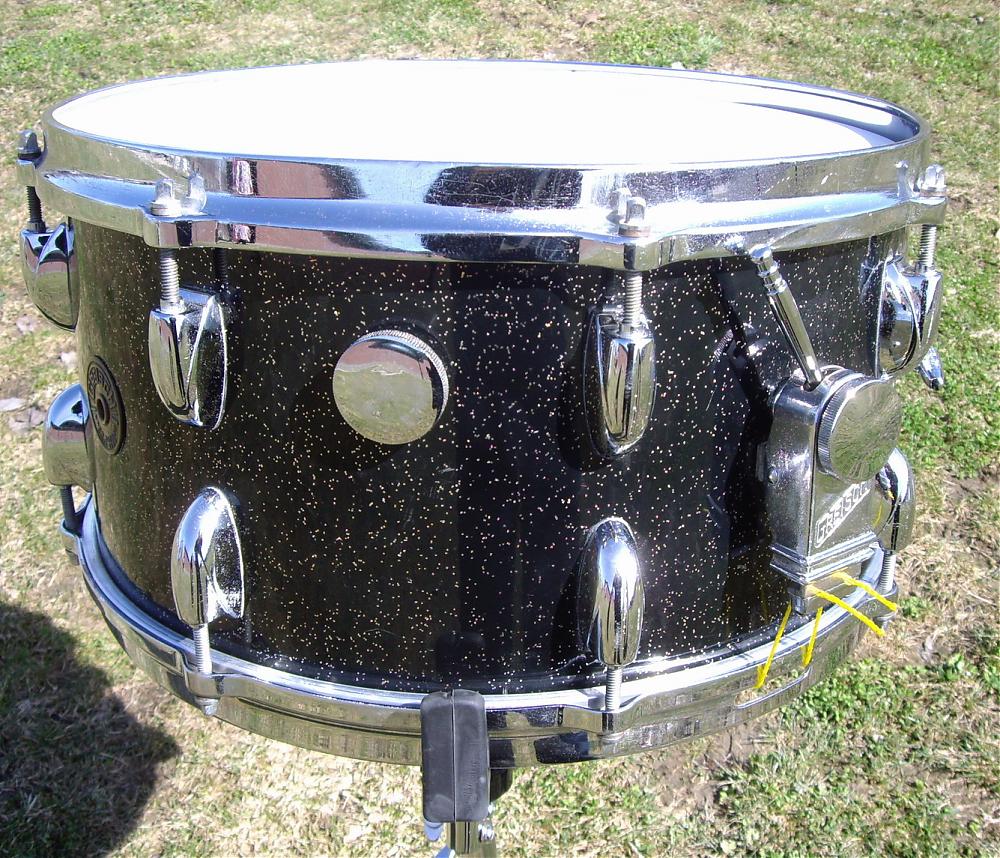 The round badge Gretsch concert snare is pretty much done, ca.1958 Anniversary Sparkle finish, 6 ply Jasper shell. It does play, I need to do some tweaking and tuning and breaking in of new heads, but it does sound good so far, I think I'll keep it! When I "rescued" it, it was dirty, dusty, rusty, just the shell, rims and some nasty heads remained. Fortunately, the micro-sensitive throw-off was still intact, minus the throw arm and adjustment knob. Unfortunately, what was missing was the very rare and hard to find single point adjustable butt end (thank you David!). There were no snares or in-shell key holder as well. I purchased vintage adjustment knob and new 20 strand Gretsch snares on eBay. Reproduction throw off handle from JP2 Creations, in-shell key holder and key from Cherie Willoughby's Repercussions Drum Shop. I polished all the chrome as shiny as I could and actually car waxed the outside of the shell which did wonders in cleaning it up, shining it and really bringing out the sparkle!
