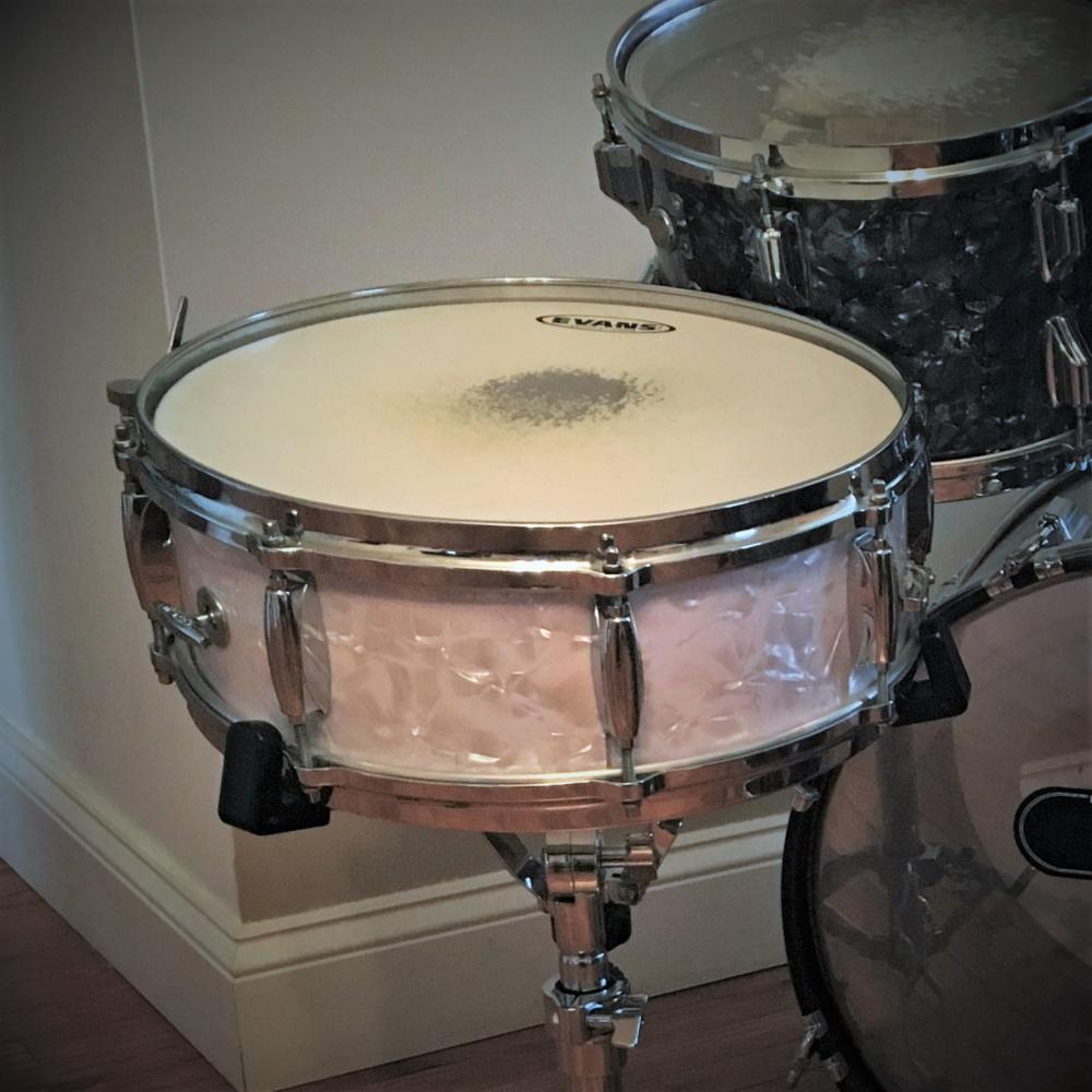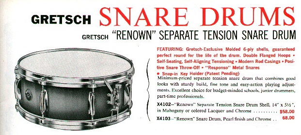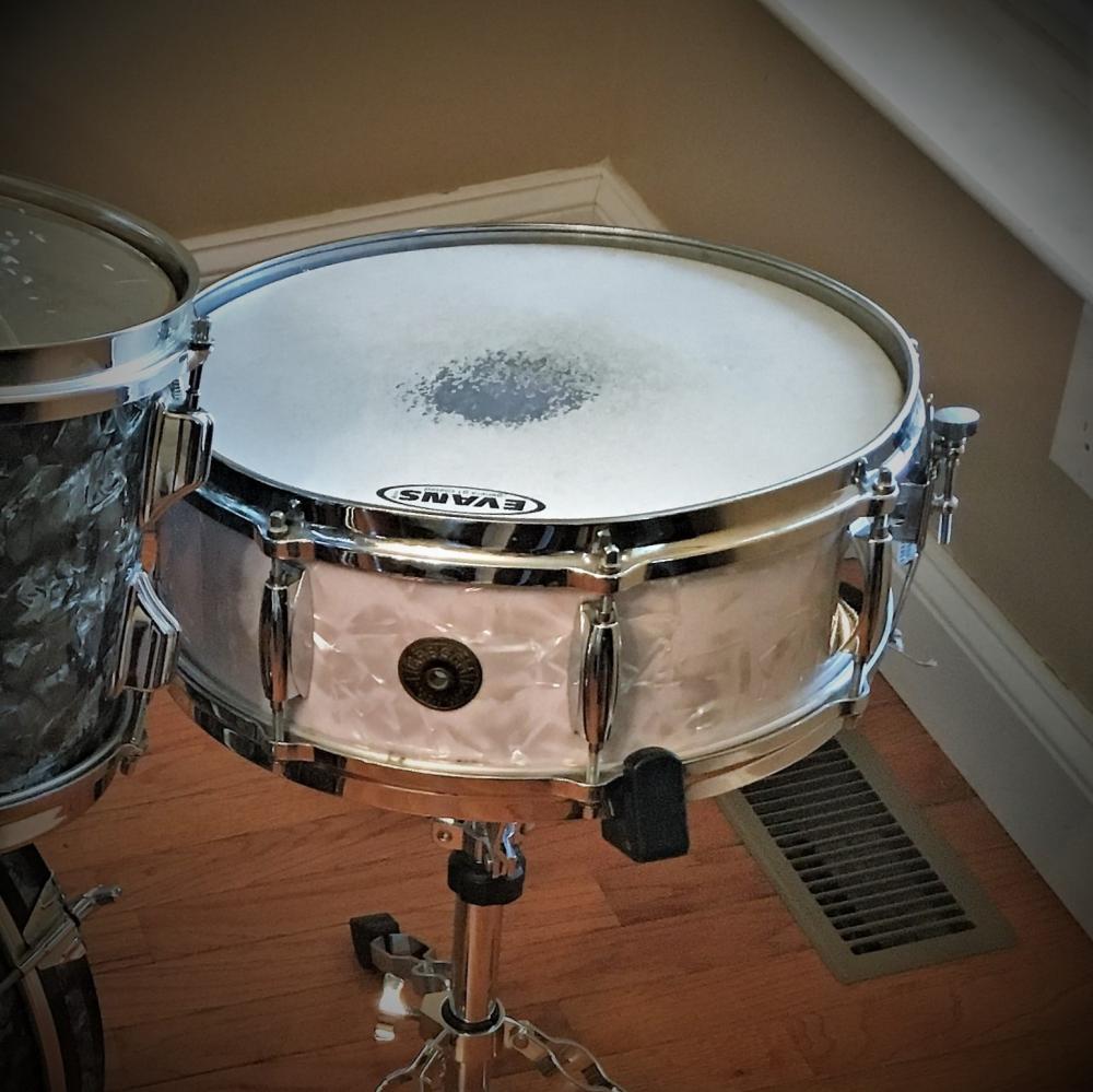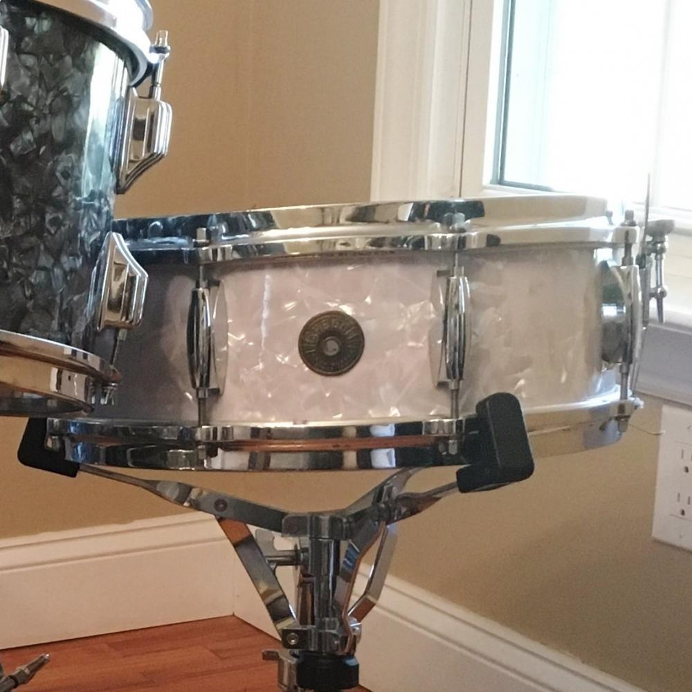I'm not well versed in Gretsch drums at all...yet this 5x14 wood WMP round badge has been my go to snare for years. Bought it off ebay and picked it up from a music store in Maryland (can't even remember which one) 17 or 18 years ago. It was advertised as a 1960s Gretsch, and that's about it. It has a drum key holder (I added the drum key later), no internal mufflers, and no extra holes.