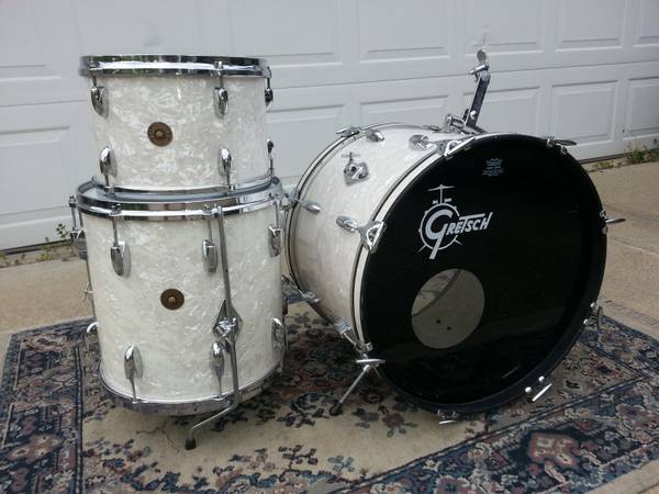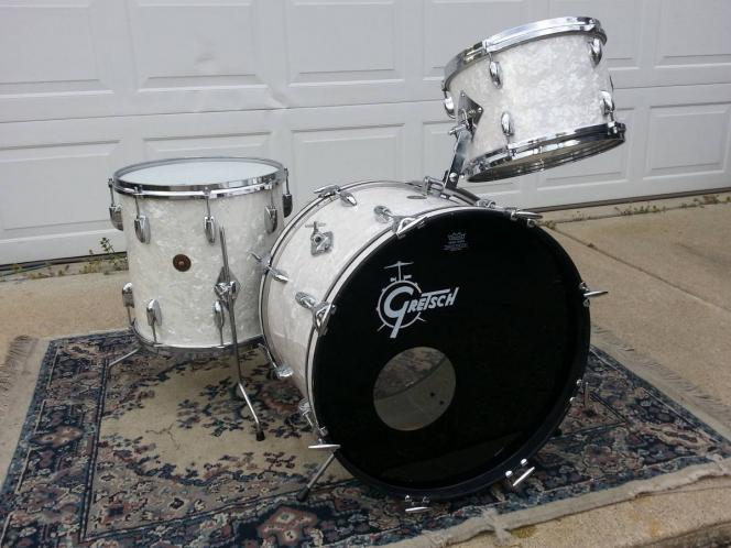 Really nice original shells with no issues, professionally rewrapped in White Marine Pearl, fresh ambassadors on toms (coated batter, clear reso) Black or white logo head on kick