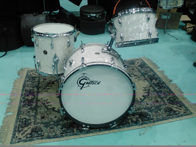Really nice original shells with no issues, professionally rewrapped in White Marine Pearl, fresh ambassadors on toms (coated batter, clear reso) Black or white logo head on kick
