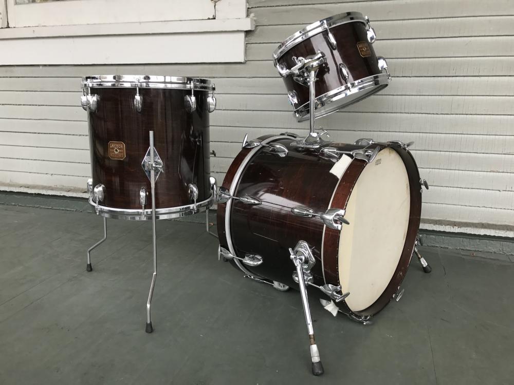 Gretsch "Bop" kit in walnut lacquer, sizes 18x14, 12x8 and 14x14 dated to 1980. One-owner kit with orange paper interior tags intact, special ordered with Slingerland mounts on the bass drum and rack tom and adjustable spurs on the bass drum. There are no modifications to this drum kit. Edges are very nice - only notable thing other than some scratches and checking is a repaired crack on the batter bass drum hoop. Era-appropriate Gretsch 'permatone" head on the resonant side. $2500 obo plus ship - email [email]christhehawthorne@gmail.com[/email] if interested and for more photos