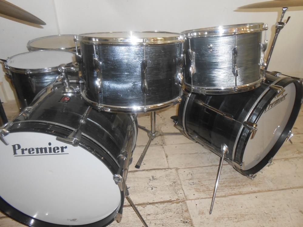Premier Grey shimmer 2 x 20 Bass Drums / 12 +14 Top Toms / 14 + 16 Floor Toms with 2001 snare. Very rare factory left handed bass drum. Nice looking set.