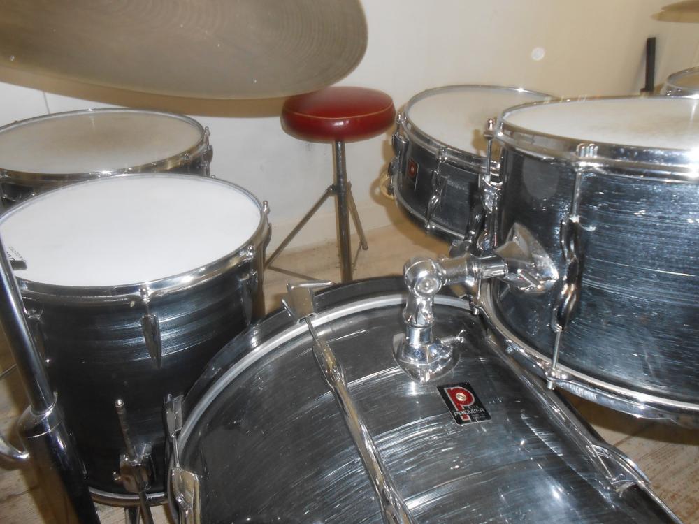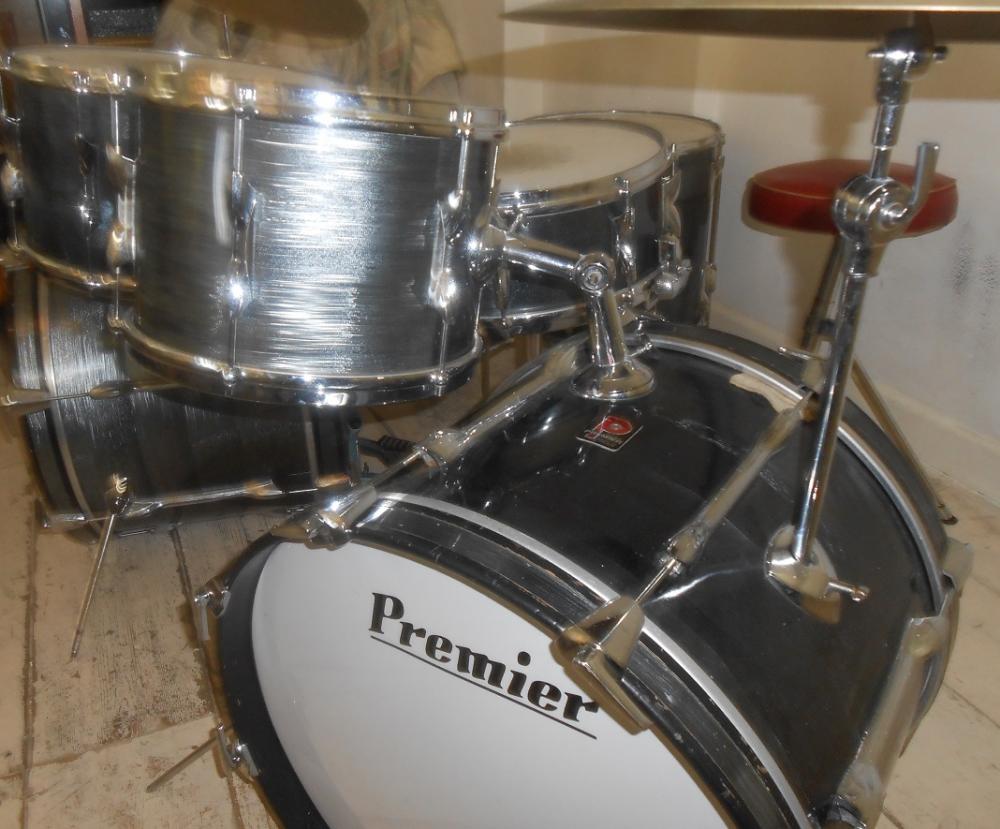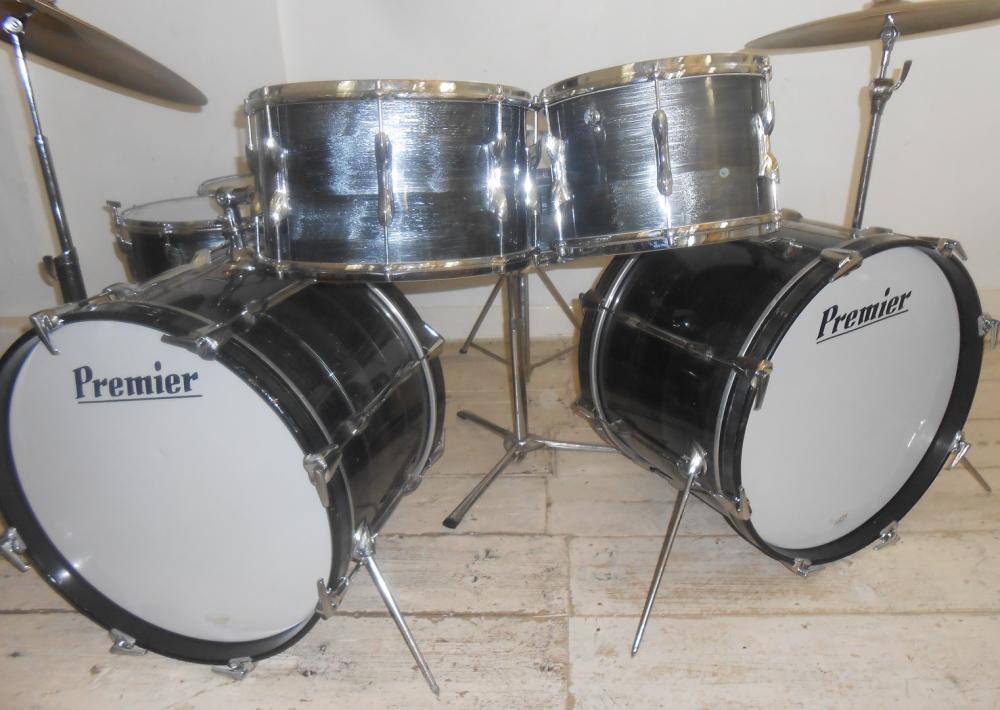 Premier Grey shimmer 2 x 20 Bass Drums / 12 +14 Top Toms / 14 + 16 Floor Toms with 2001 snare. Very rare factory left handed bass drum. Nice looking set.