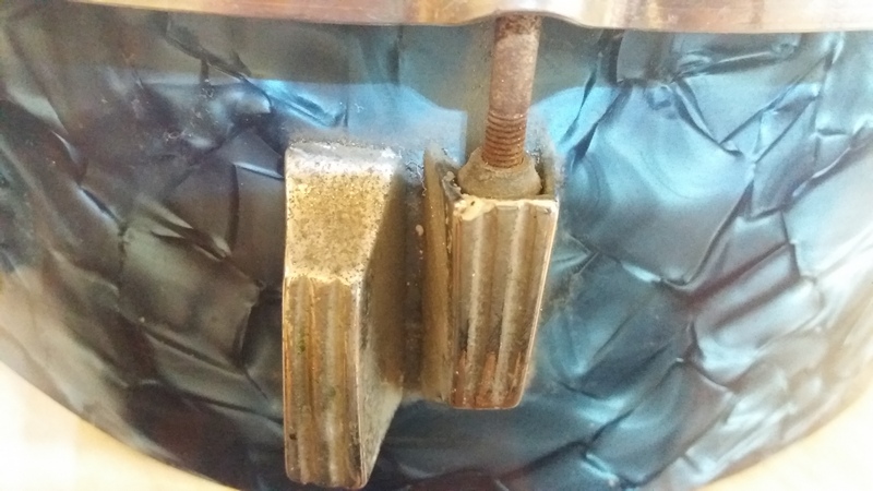 Interesting strainer, 6 lugs, carbolite muffler knob, deep flanged S-hoops -- it's indeed mystery snare....