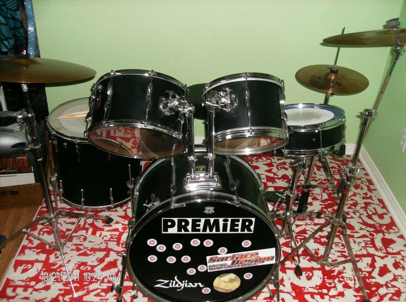 What are the drum sizes? That tom mount looks like a Pearl mount that's been added, and the tom mounts as well. The Premier wing nuts look like the one on the cymbal mount, not the tom hardware. In my opinion, this would be a functional improvement to the stock, Premier mounting system. I also wonder about the bd hoops. Are they metal?
