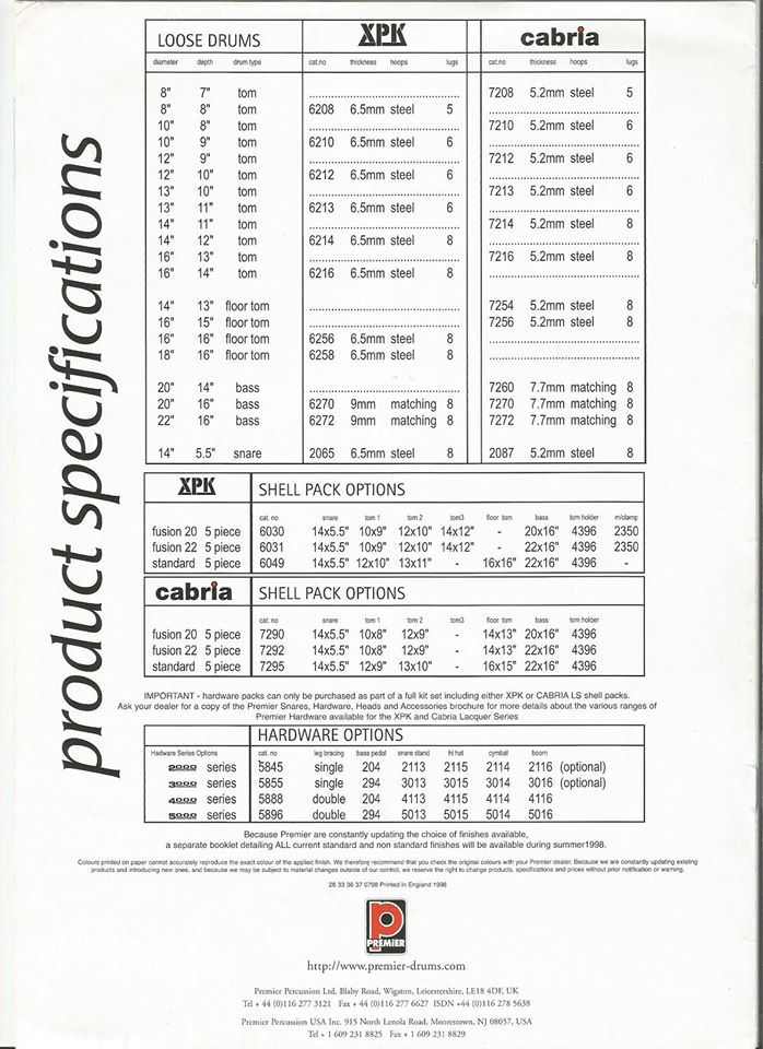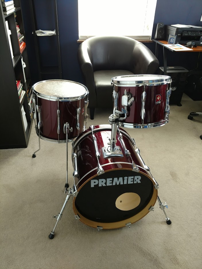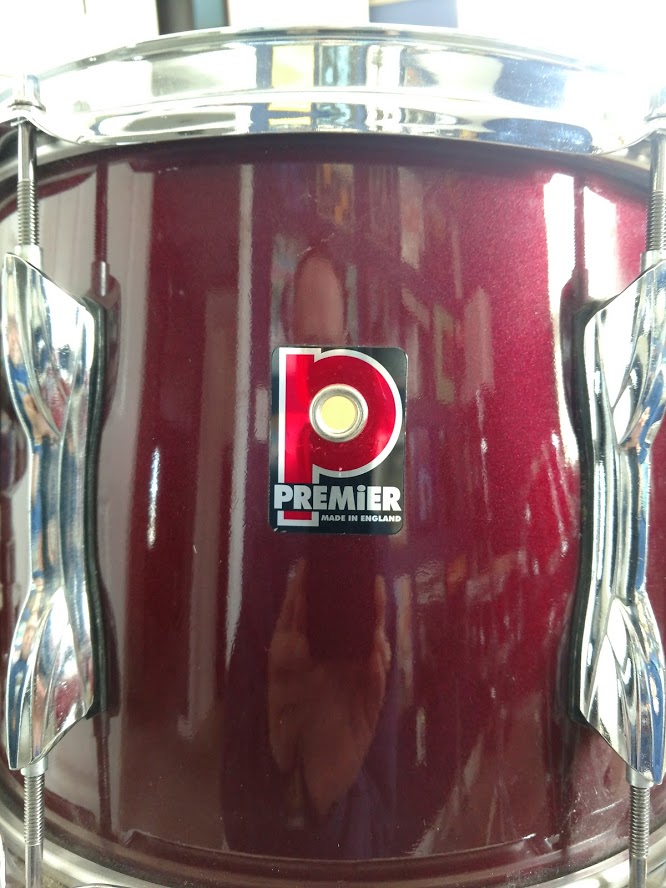 I picked up this kit for a good price. Sizes are 12/14/18. I'm trying to determine which model or series they were. There is no identifying information anywhere except the Premier badges. The badges say they are made in England (which we all know), which I assume is at least good, as they weren't really low level Premiers made in China or Taiwan. I know they probably aren't high end either, due to the lack of a suspension mount on the rack tom and eye bolts on the tom/floor tom brackets. Aside from a little wear here and there, they are in very good shape. The spurs are not original, and there are a few extra holes where the old ones were, but not a deal breaker. Also, I know that it looks like the generic "Wine Red" wrap, but these are actually a lacquer finish. There is no seam anywhere on any drum, including where they may have hidden it under the long lugs (there is still no seam present between the end of the lug and the bearing edge on any of the shells). It has a bit of metallic hint to it, but it definitely is a lacquer and not a wrap.