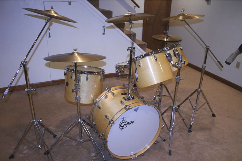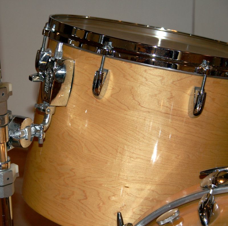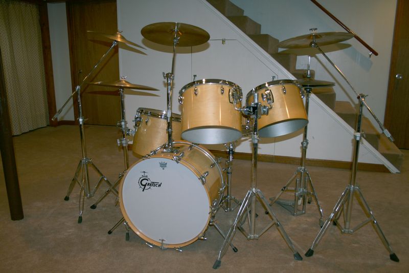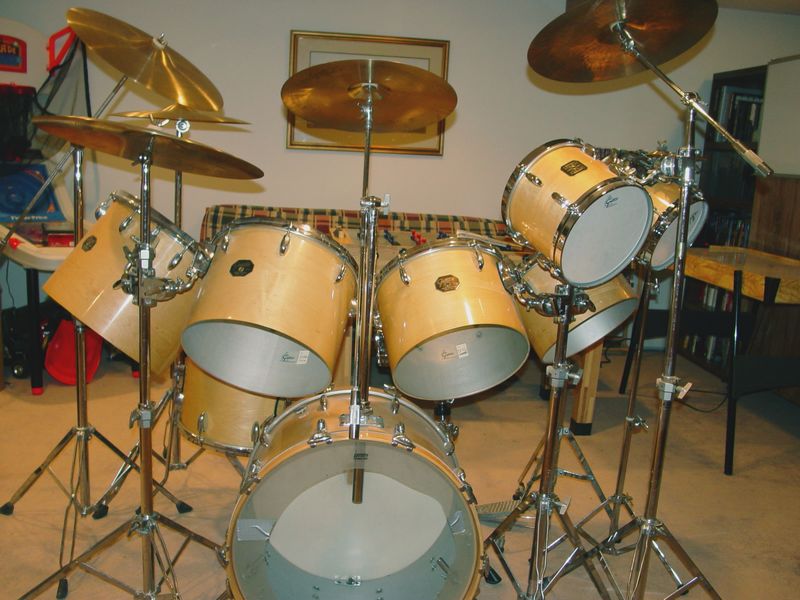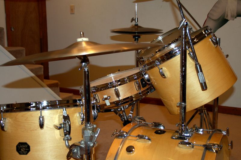 Anyway, here's what I know: The drum sizes are 5x14 metal Snare, 14x22 Bass, Concert Toms (single-headed) are 8x12, 9x13, 10x14, and 12x15, plus a 16x16 double-headed Floor Tom. The drums have a natural maple finish, except the snare which has a chrome finish. The badge is the stop sign with the drop-G above the hole. The inside finish is silver, and the gray/white label inside the 12x15 has a hand-written model# 4453w, and a stamped serial# 108104.