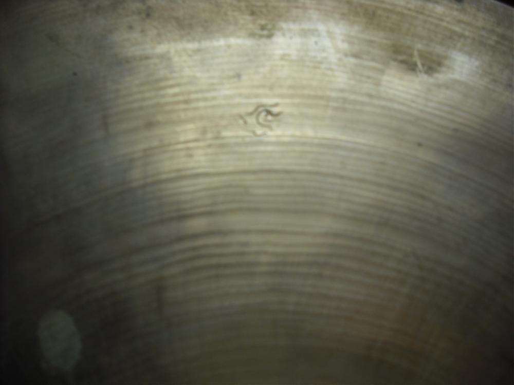 jaye, thanks for the input! sounds exciting. i love finding stuff. im a garage saleaholic and also a drummer so occasionally i will find drums and stuff. this was either found at a tag sale or even at the dump. i have half a dozen old slingerlands ludwigs and others ive rescued from the crusher. either way not more than 5 bucks. i was able to get a pic of the top stamp. its not very clear but i think you can see what it looks like. i read your wikipedia thing (nice work) and did it not say ajaha cymbals have no stamp on the top? heres the pic. thanks,ryan