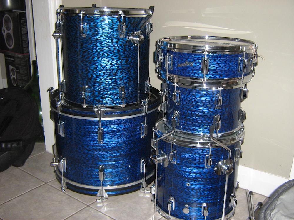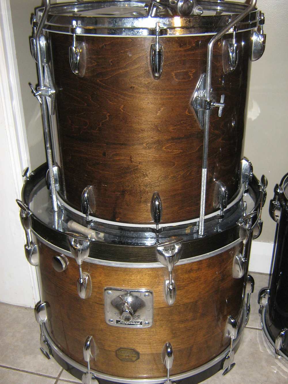 They have some scratches, a little pitting, the 13 inch has a top ring that needs a little love, the original tom holder was replaced with a slingerland, and the bass drum has one tension rod that isn't original. Overall, their condition is quite excellent. The inside tags are orange/yellow, and the inside of the drums are silver (this is a jasper shell thing?). Also, note the 16 has that non-standard ebony stain. That drum alone may be as valuable as the whole kit on it's own. I saw a 14 go for $1500 in this model. I'm not sure at all: