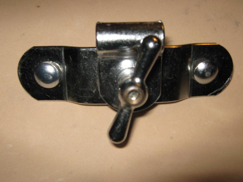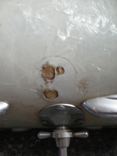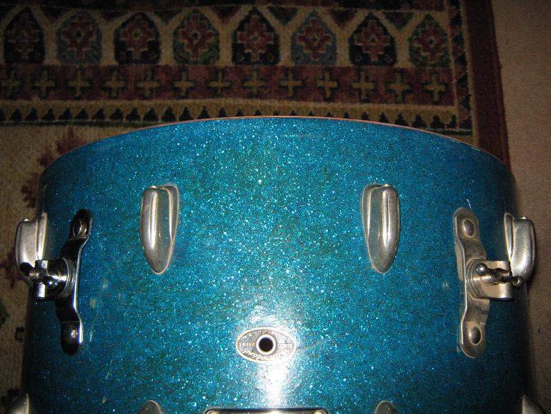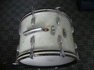 As you will see from the pics below the drum is not in great shape: there are 4 extra holes on either side of the drum. My guess is that one pair (to the far right of the rail consolette) originally contained the cymbal mount. No clue what the other pair of holes are from. The original bass drum legs have been removed (the holes have been plugged sloppily by someone) and replaced with Rogers legs. The wrap is not cracked, looks to be in ok shape, and has mellowed nicely. Hardware also appears in good shape, but is in need of a cleaning. Oh and there is one mount of some-kind (not sure if its original or not) to the right of the rail consolette (does anyone have any clue what this is for? )
