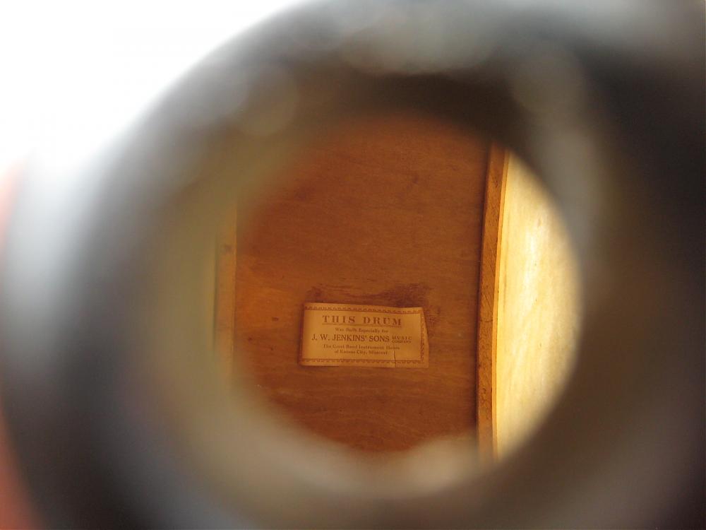 The bass drum tag inside says Mfg'd for J. W. Jenkins and Son by Great Musical Instruments in Kansas City, MO.