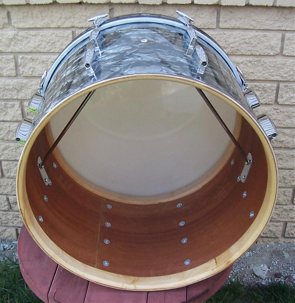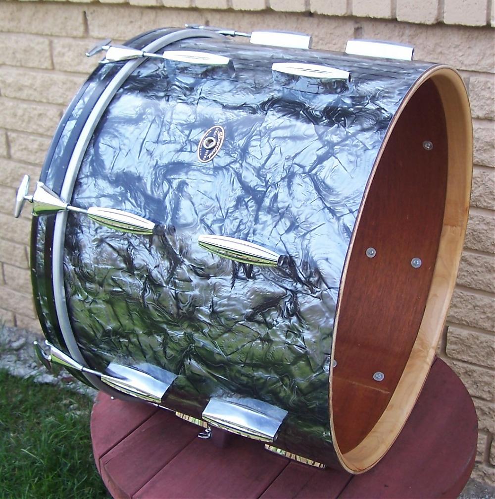 Now I'm considering selling the 20 inch Slingerland bass drum, which is in immaculate condition. However, I've got some questions that I'm hoping you Slingerland experts can help me with. The drum is a "virgin", measures 20 x 14, has the Slingerland Niles Black & Brass Badge (no serial number), and is date stamped "P APR 61" on the interior of the shell. I believe that the shell is 3-ply mahogany-poplar-mahogany with 1 3/8" reinforcing rings. Mounted on the shell are 16 single-ended large streamlined lugs. The 16 t-handles are the "torpedo style" and the claws are those commonly seen on late 50s - early 60s Slingerlands. The BDP pearl finish is "stunning" and has probably aged somewhat to a darker shade with a bit more of a black on black character, which I've read is quite common for Slingerland's BDP pearl finish between 1956-1964. The drum came with its original Slingerland logo calfskin heads and wooden hoops with BDP in-lays.