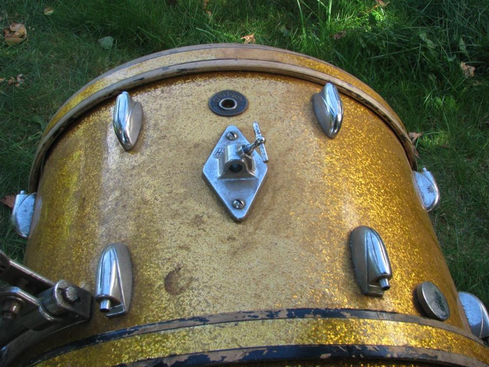1954 Broadkaster Bop kit and 1958 Gretsch BD badges are not centred - they're closer to the resonant head. The Gold Sparkle bd shown here is how it looked when I picked it up in Sept of 2009 - after it was in storage for decades......un-cleaned, but nice view of bass drum badge location. My 1968 SSF Gretsch bass drum badge is right behind the big ugly tom holder - closer to the batter head in this case.