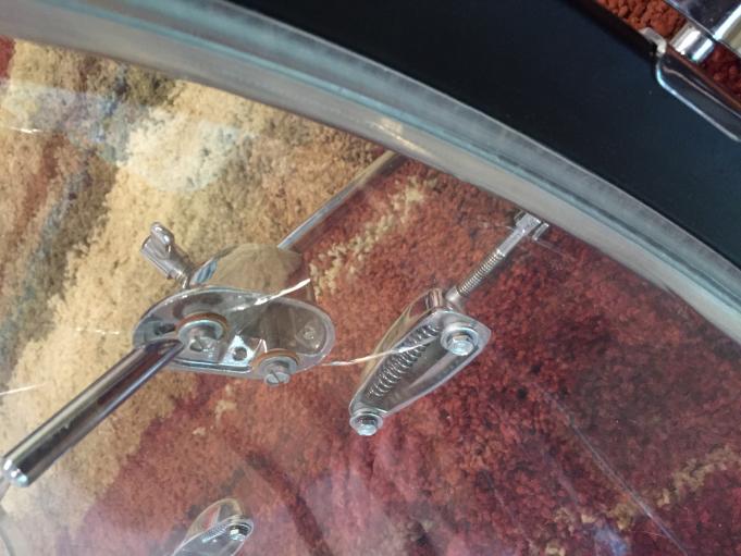 Bass drum first, insert the spurs, attach the pedal. CRACK! The bass drum formed two curved cracks emanating from both screws of one of the spur mounts! I had elevated the reso hoop half an inch like I have always done with my conventional drums.