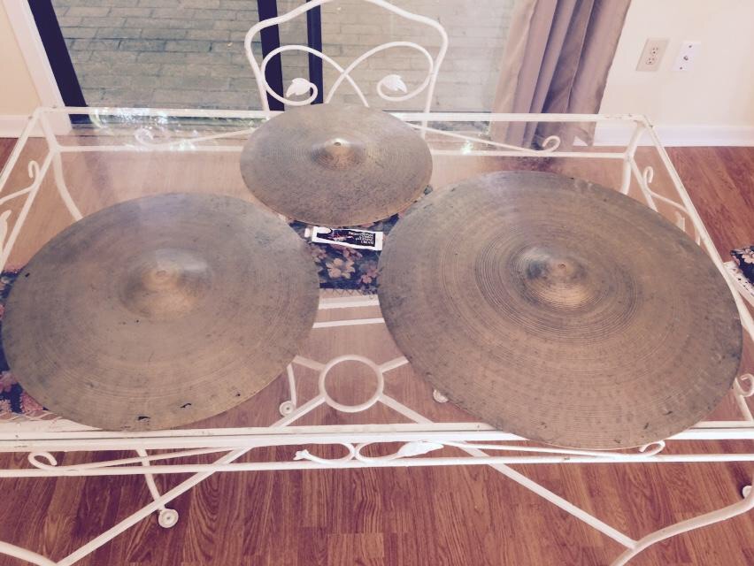 I called the seller an elderly gentleman himself and he said yes they were still available. He happened to live 4 miles away from Daddy'O and said they have been in storage for quite some time and needed a good cleaning. I asked him If he would be so kind as to deliver them, and Pops would pay him. Pops (not a drummer)is keeping busy at 87 years old & I will be coming down to see him in a few short weeks. My best guess is they are A Zildjan from the 70's but only time will tell. I am very lucky and very blessed that he is still with us and is still there when u need him. Enclosed is a picture as they are when my dad received them.