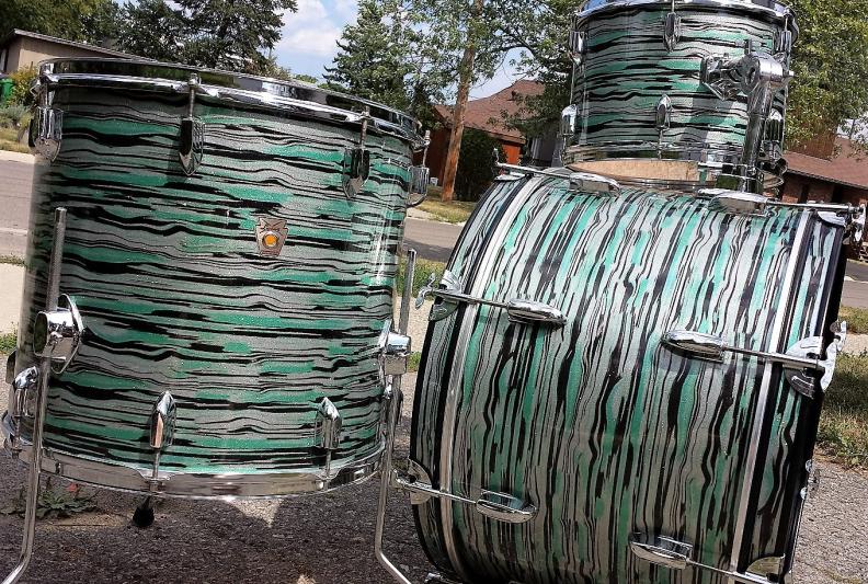 The shell's origins are unknown. The 22X14 bass and 16X16 floor tom appear to be maple. The bass drum has old holes from a rail consolette.