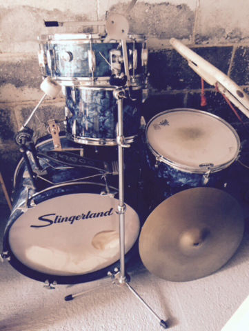 Really nice kit, in what looks to be Blue Oyster Pearl.. Check out that snare drum.. Offset lugs ?.. Comes with Ludwig speed king pedal and hi hat stand, but no cymbals.. If i wasn't going on vacation, i'd probably get on this one.. Looks decent and for a decent price..