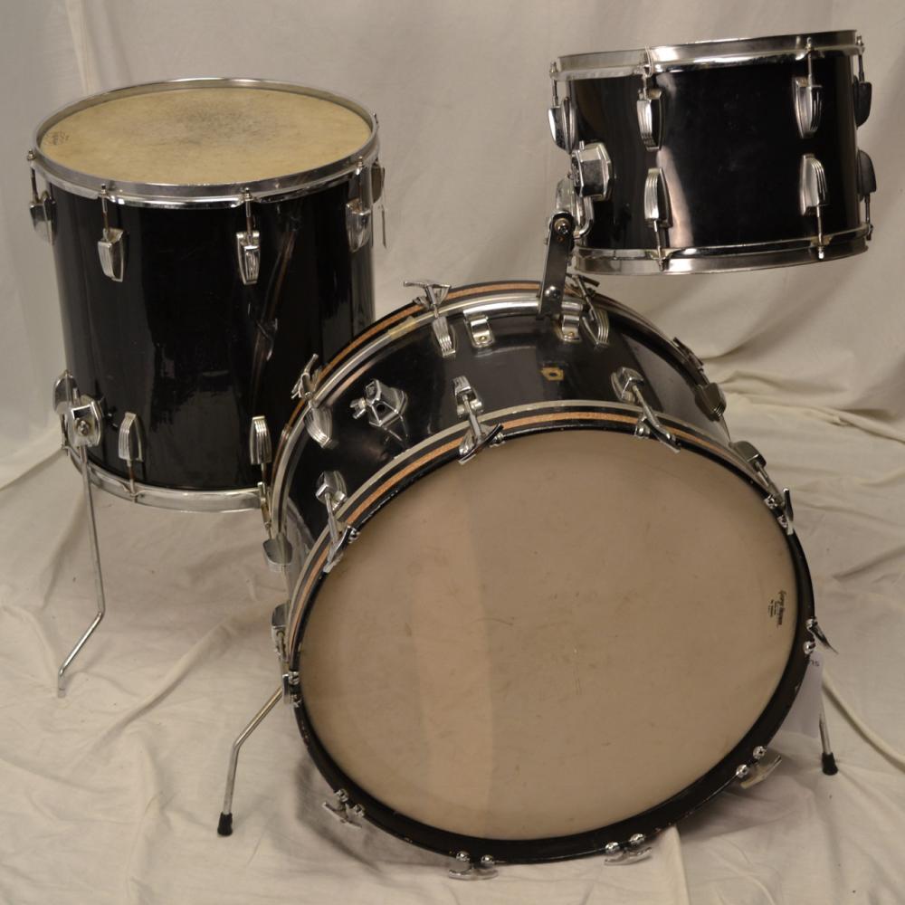 This Mitch Mitchell set is a black wrap and the sizes are 9x13, 16x16, and a 12x22 bass drum. The traditional bass drum depth of this era was 14", however, some drummers including Ginger Baker, preferred the quick response of shallower depths. As a result, Ludwig would make the size to suit the artist's needs. The drums are unique in that there are no ventholes in any of the drums and no badges on the 13 and the 16. In fact, the badge on the bass drum is glued to the shell, and there is no venthole there. The bass drum has a tom holder mounted onto the drum in the top panel, which is a bit different from the standard offset position. The floor tom also has an added Ludwig bracket near the top of the batter side. Brackets such as this were sometimes added so as to be able to mount a cowbell or other item. The tags from the Bonhams auction are still on the drums. Amazing piece of rock history Steve Maxwell