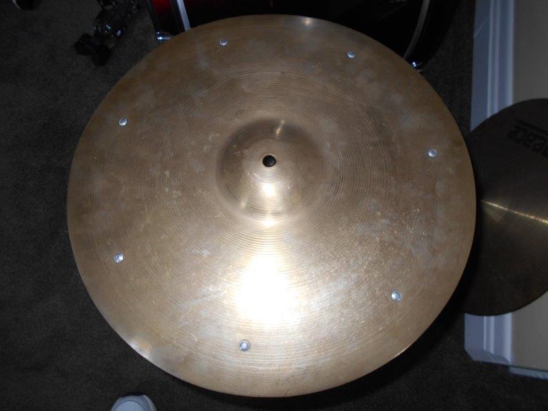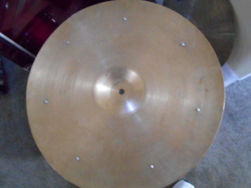 Cleaning it may reduce the value. The rivet hole pattern and rivets themselves look like they were added after the cymbal left the Zildjian factory. I don't have strong pricing evidence on whether or not rivets affect the price of a cymbal, but we're talking $10-$20 in expected price and that small an amount is hard to estimate accurately given all the other factors influencing prices. You should weigh the cymbal as this provides a bit more information. Reporting the weight in grams is customary, but ounces (or pounds and ounces) is fine. Back in the late 1940s that could have been a ride cymbal.