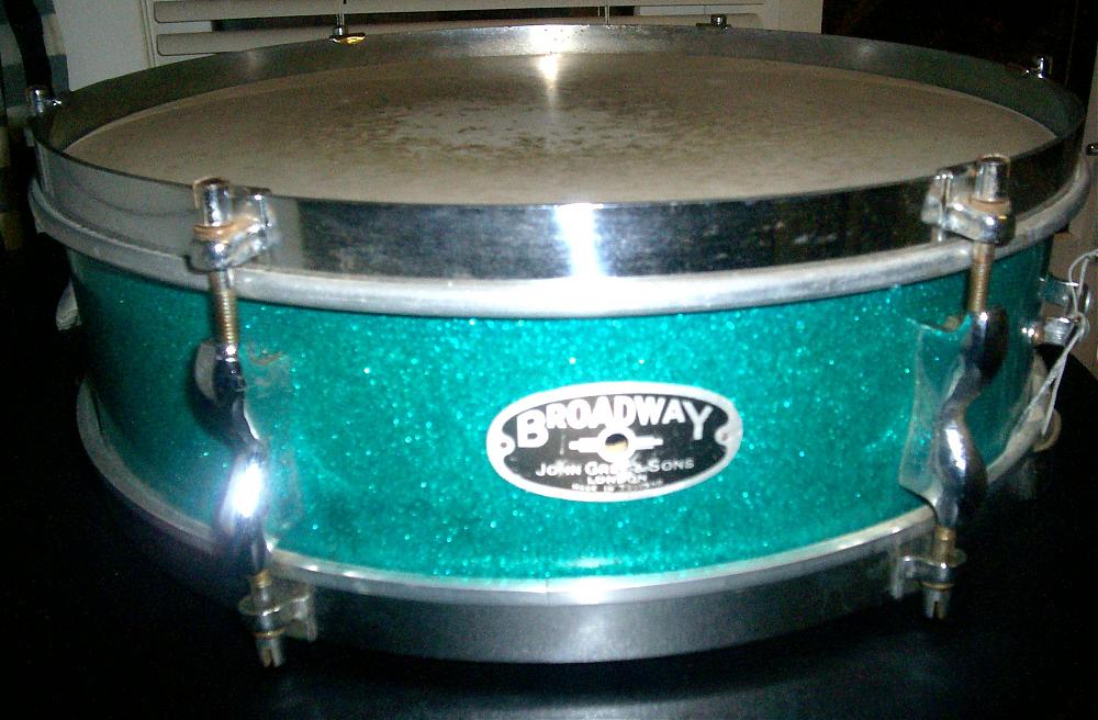 Model 502, I think it is. The throwoff looks like it has been changed . Hard to tell from the pic but it looks like one taken off of an Olympic Discus , picollo snare.I remember the Broadway throwoff to be an in out rig. Likely from the 50's because of the clipovers. LOVE that aquamarine wrap. If it has a glossy surface and has tiny particles, it likely came from Germany---------same used by Trixon in the time.