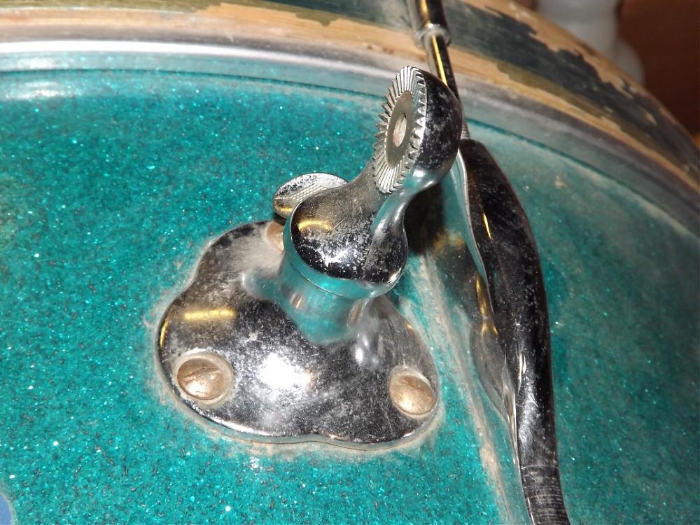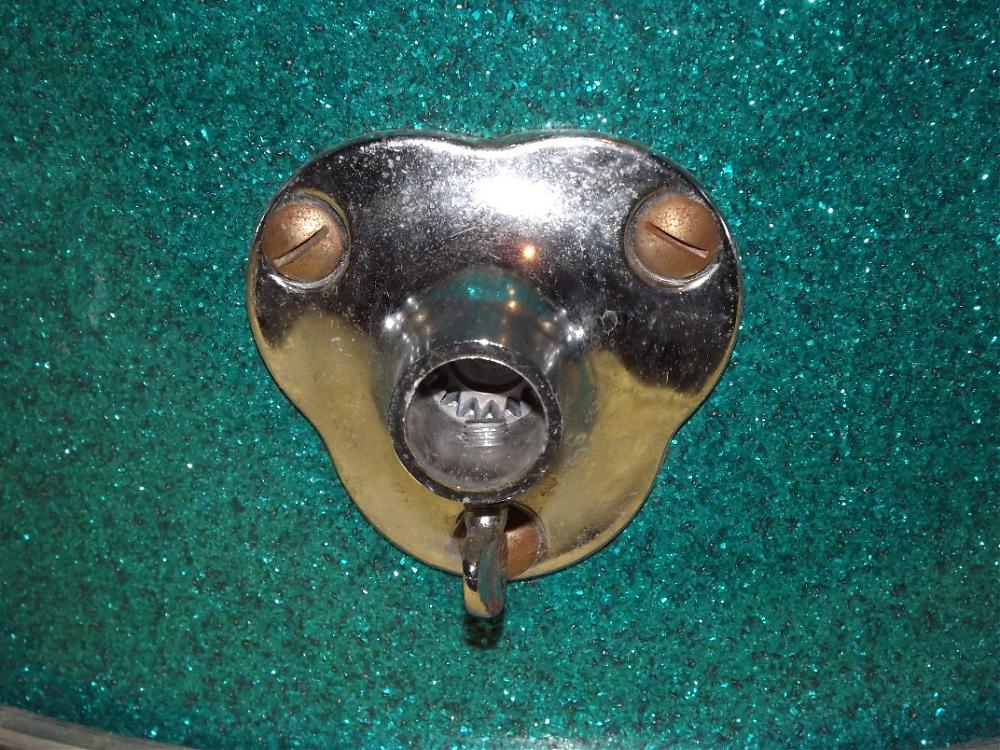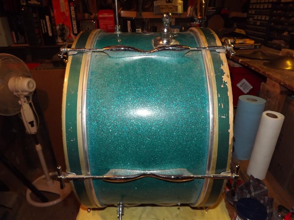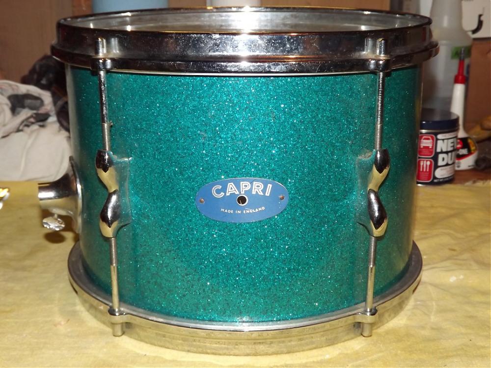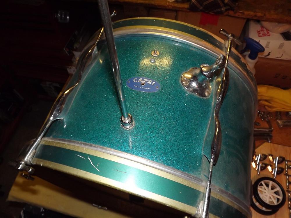 Here is my newly acquired green sparkle John Grey Capri set...I just got these yesterday so I haven`t had time to clean them up yet...The wrap is near mint on all drums except around both bass drum spurs where they have been both "punctured" through the shell as if someone sat on the drum...Someone has attempted to fiberglass the one spur hole inside the shell...I think that I can fix this, but it will always be the weak point...