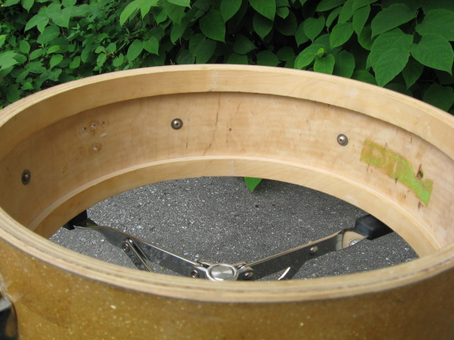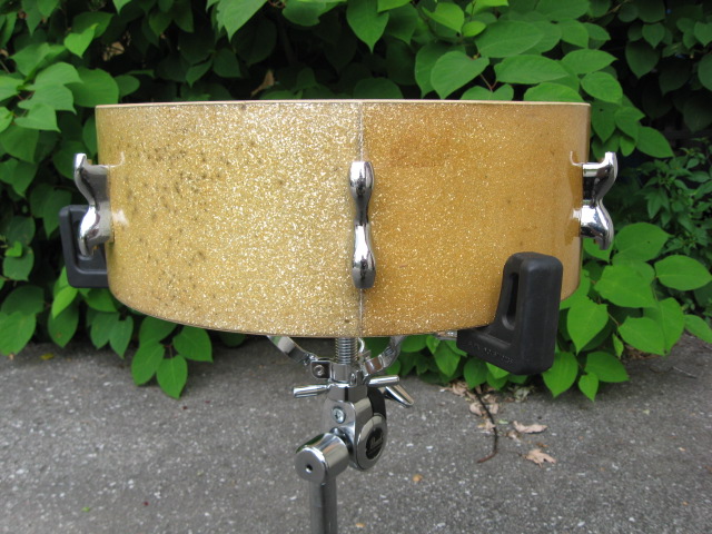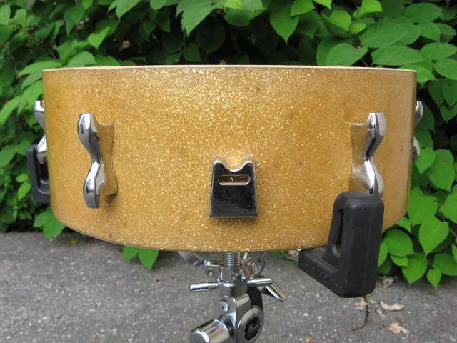 John Grey "gold sparkle" . There are two panels of wrap that have aged differently, don't think it's a re-wrap. 6 lugs, no badge, student Broadway? 12origional slotted tension rods. Hoops seem orgional. 4 holes for the throw, 2 vertical, 2 horizontal.