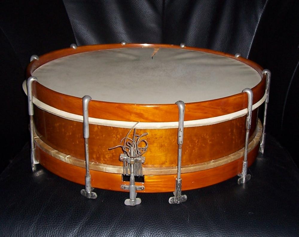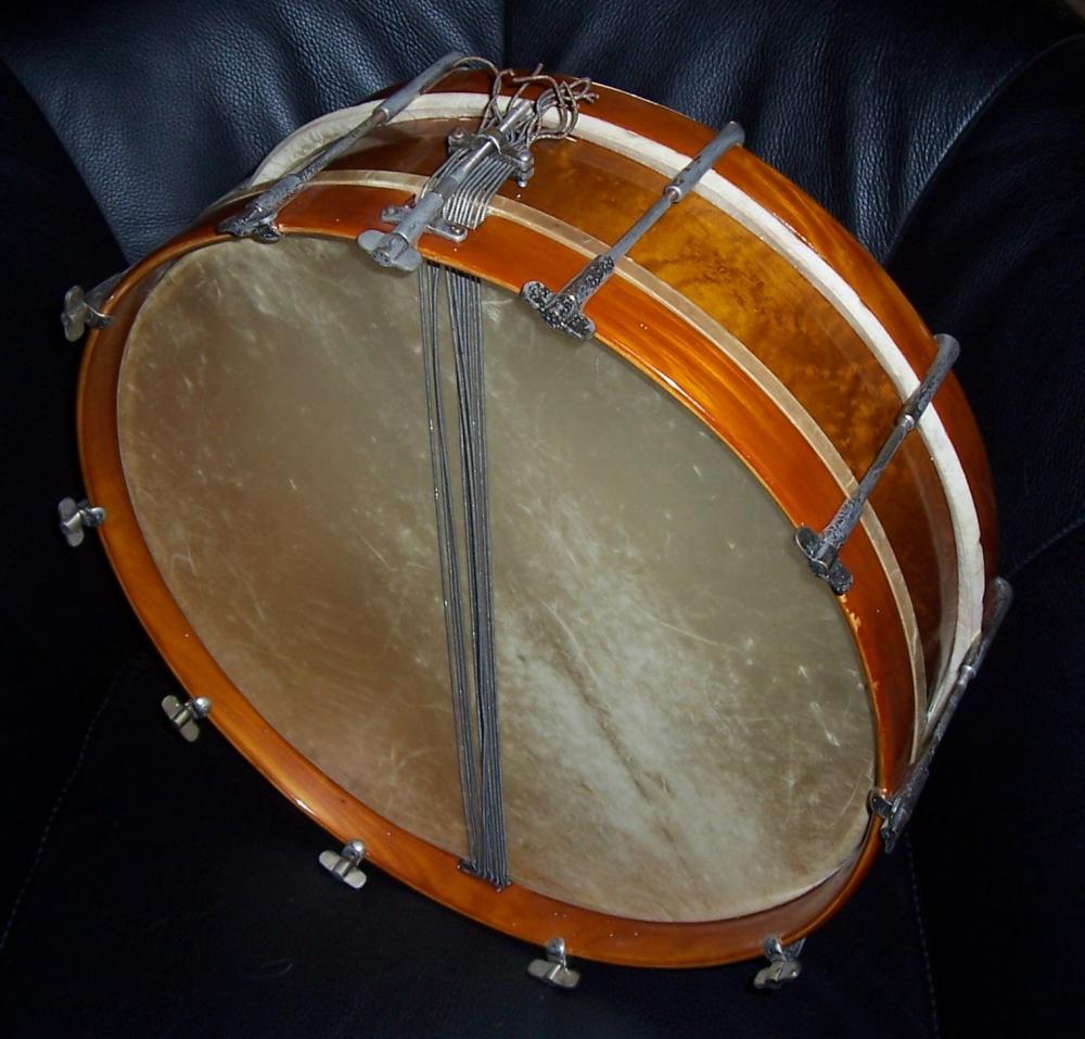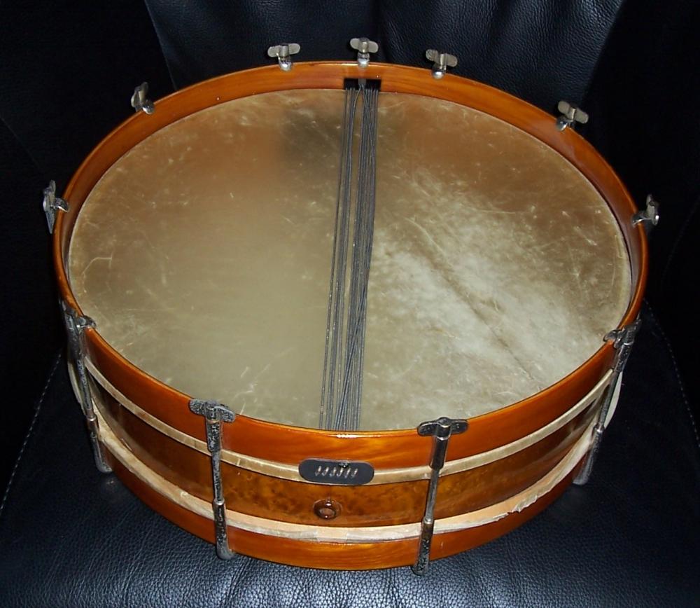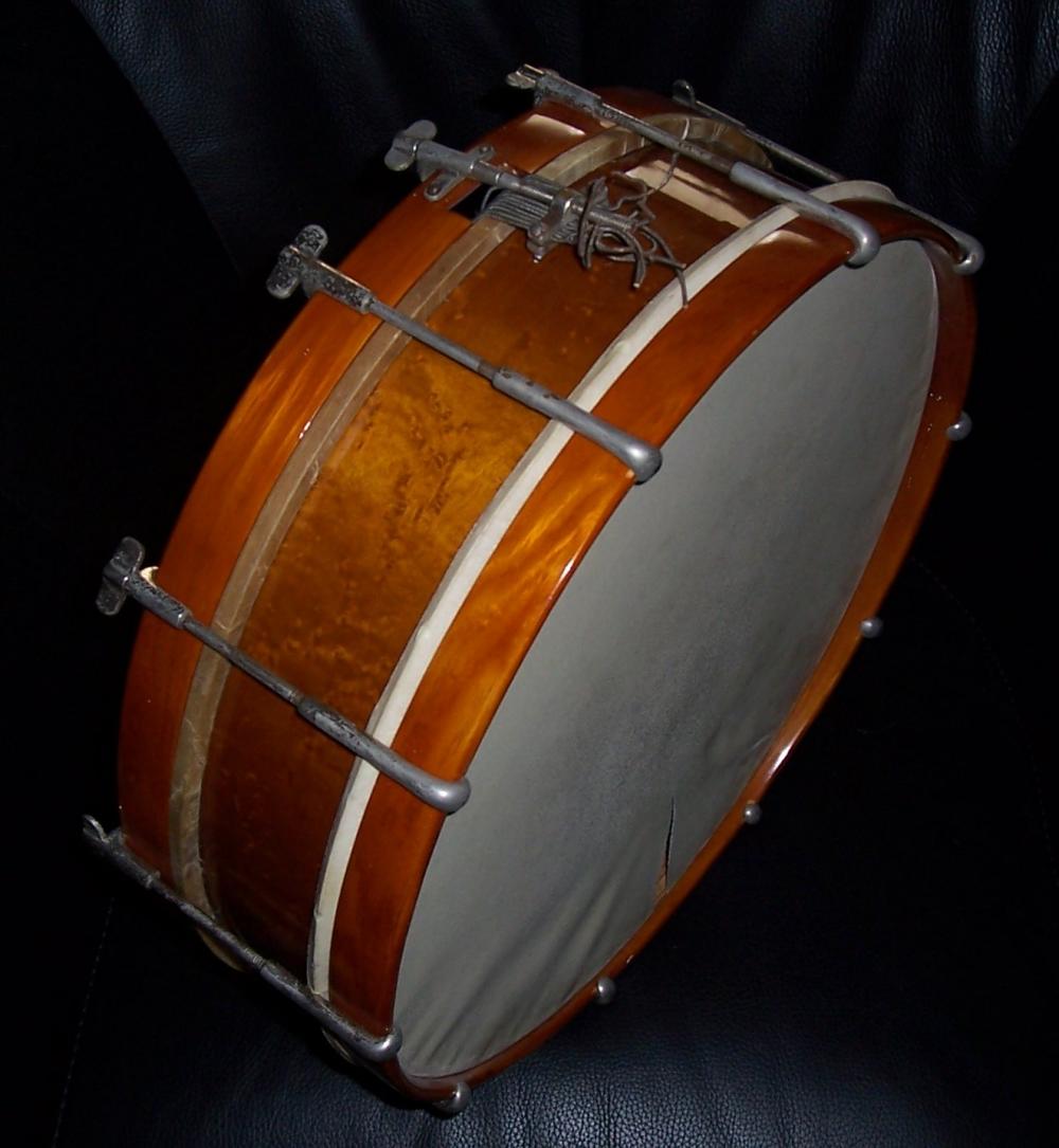 I picked up this J.W. York & Sons snare several years ago, along with a 26 inch bass drum, manufactured by the same company. The snare has 16 inch heads. You'll notice in the pics that the batter side head is ripped. I want to replace it with something that would provide a similar look and similar sound to the original, without having to go the whole route of having a custom-made calfskin head made. Any "words of wisdom" would be greatly appreciated. THANKS!