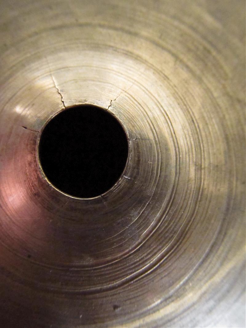 It is old and dirty and has a few hair line cracks at the hole on the bell.