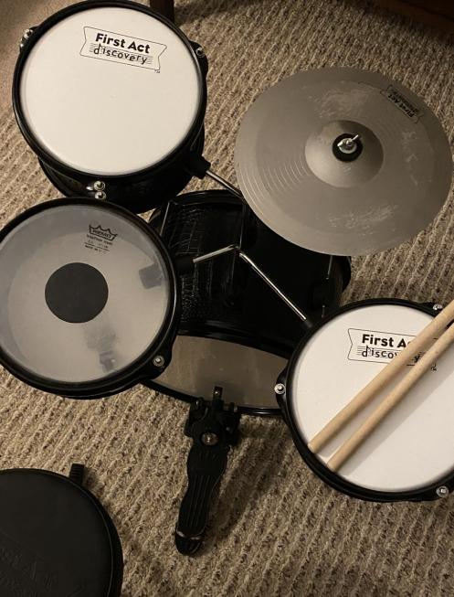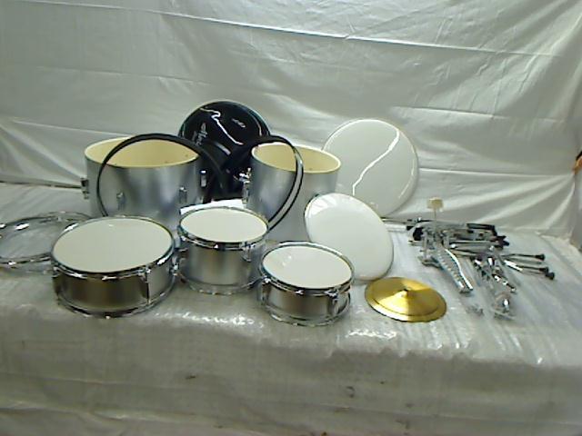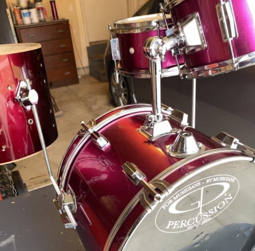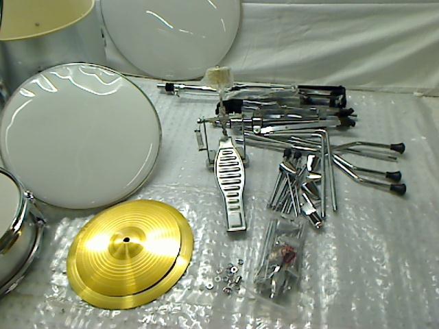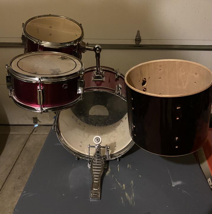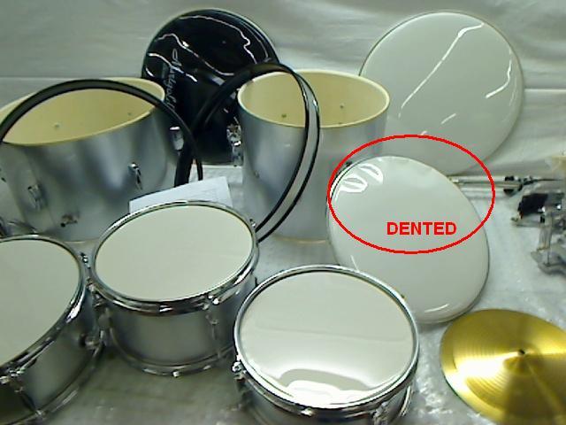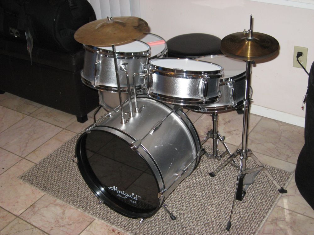 I picked up a kid's "Marigold" kit on eBay many years ago. $25 plus cheap shipping! The first 4 pictures are from the eBay post. The seller even put a red circle around a drum head to let buyers know it was "dented"! It was easy to see there was nothing wrong with the heads! All the hardware and cymbals were included. The snare drum used a tone control with some snare wires that came up against the top head for a "snare" sound. I installed some snare beds and a "real" strainer and butt. Installed some Attack heads on the batter side of the toms and snare, along with a 16" tom head I had for the bass drum batter. It sits over at my girlfriend's house and is a hoot to play!!