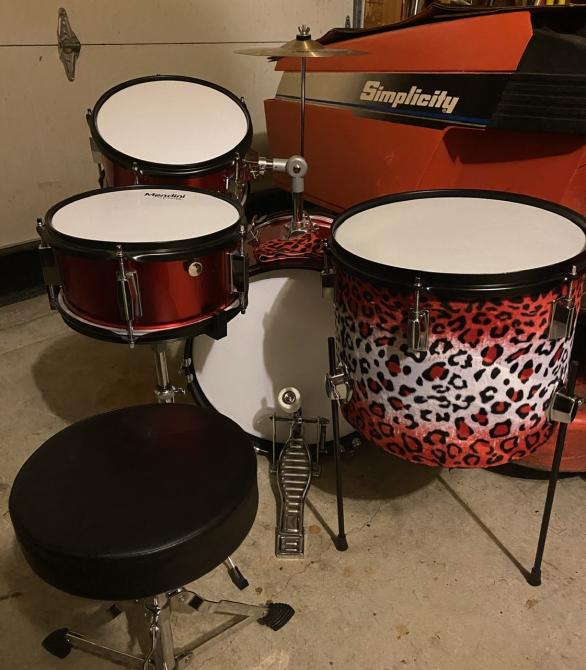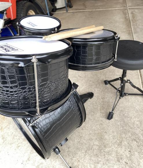 I’ve had some child sized drum kits around the home and my Granddaughter had outgrown them. I decided to customize them for fun. Here’s a couple I’ve done. The black one, I wrapped in a black vinyl alligator skin, added a tom. The red one, I made a custom 13” white and red Leopard faux fur wrapped floor tom.