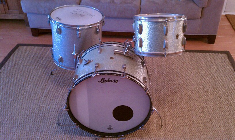 I bought this WFL kit for $300 a few days ago. It's late 50's, 22/13/16. The floor tom does not match, its a 70's/80's MIJ no name. Sometime I'll find a matching one. For now I'll be restoring what's here. Here are some "before" pictures, I'll continue posting as I make progress.