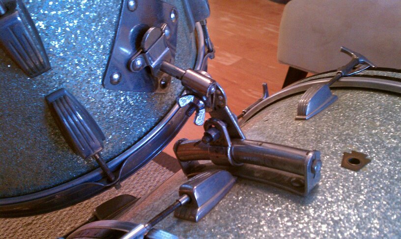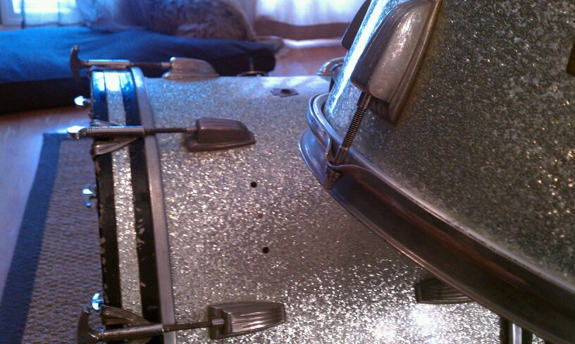 Some details: a previous owner either added or replaced the bass drum spurs with 70's spurs. Not a huge deal, but they did a pretty bad job drilling the holes. Also, it looks like they moved the tom mount more towards the middle of the bass drum. There are some other random holes in the bass drum too. I can't find date stamps on these either. Is that normal for late 50's? The rack tom has something that might have been a date stamp, but its in black ink and no longer legible.
