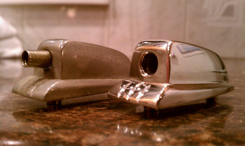 I started cleaning and polishing today. I went straight to the buffing wheel on my bench grinder. This worked great, took all the gunk off and shined it up in one step (then just a quick wash off in dish soap/water). You just have to be careful that you don't take too much of the plating off. Here's a before and after photo. I might still try a cloth and some metal polish to see if they get any shinier.