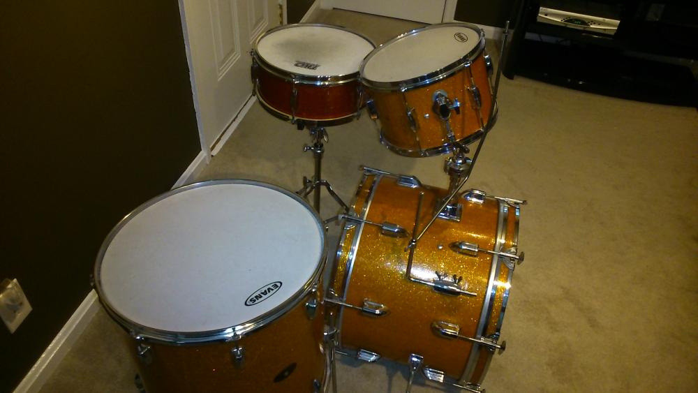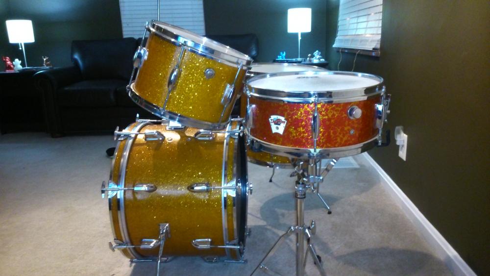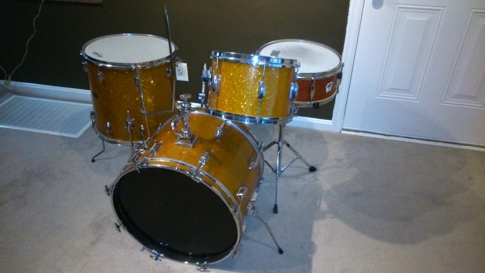 If anyone is interested in the snare, let me know. It is six lugs, has stick saver hoops and has the original bottom head and snares. Strainer and butt also appear original and there are no extra holes. 3 ply with re-rings. Wrap has a few "wrinkles" in it but otherwise in good shape.