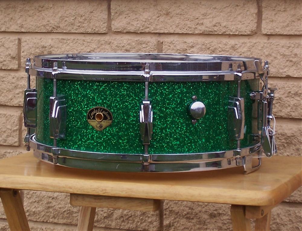 I was fortunate enough to obtain this Leedy & Ludwig snare drum recently. It features a 3-point strainer, extended snare butt, 8 Imperial lugs and horizontal muffler system. The prior owner wrapped it in a modern white pearl finish. Since I wanted it to reflect the era in which it was manufactured, I had it done in a Green Glass Glitter.
