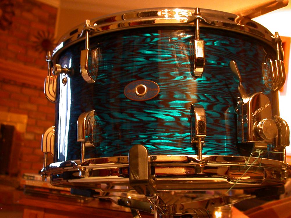 The Blue Onyx wrap is really nice! The stock "Zoomatic" strainer on a Leedy drum is testimony to the demise of Leedy following Slinglerland's purchase of the Leedy factory in Chicago and its ultimate closure. So, this drum having Slinglerland strainer, shell and hoops with gorgeous Leedy small beavertail lugs, represents the end of an era.